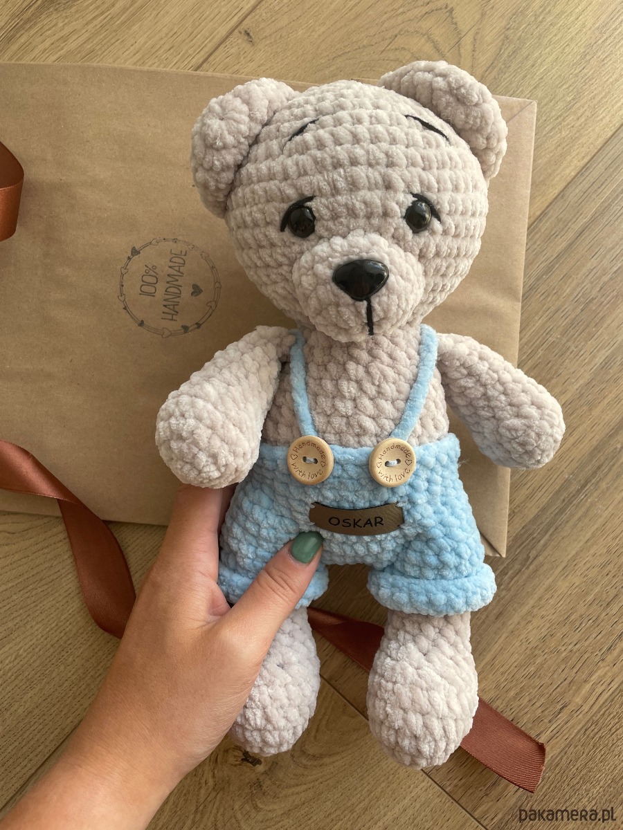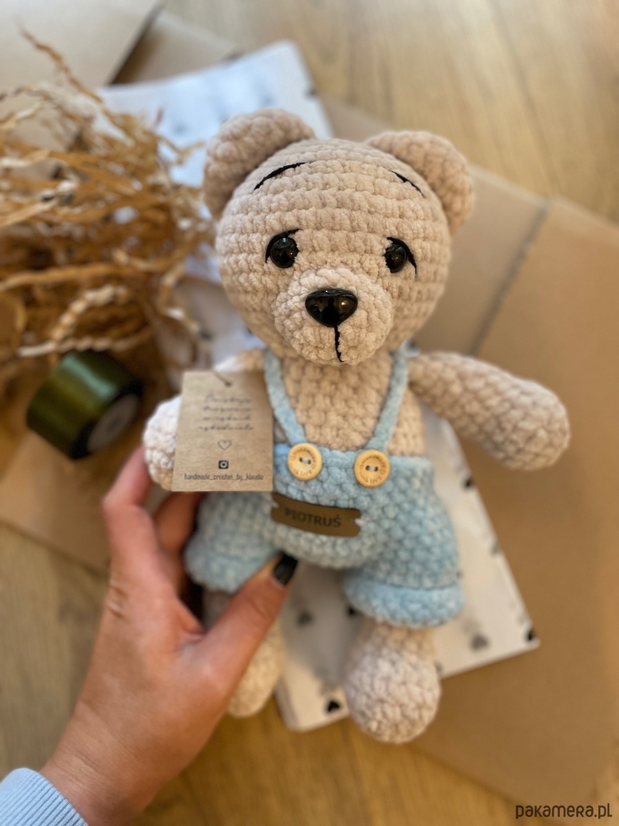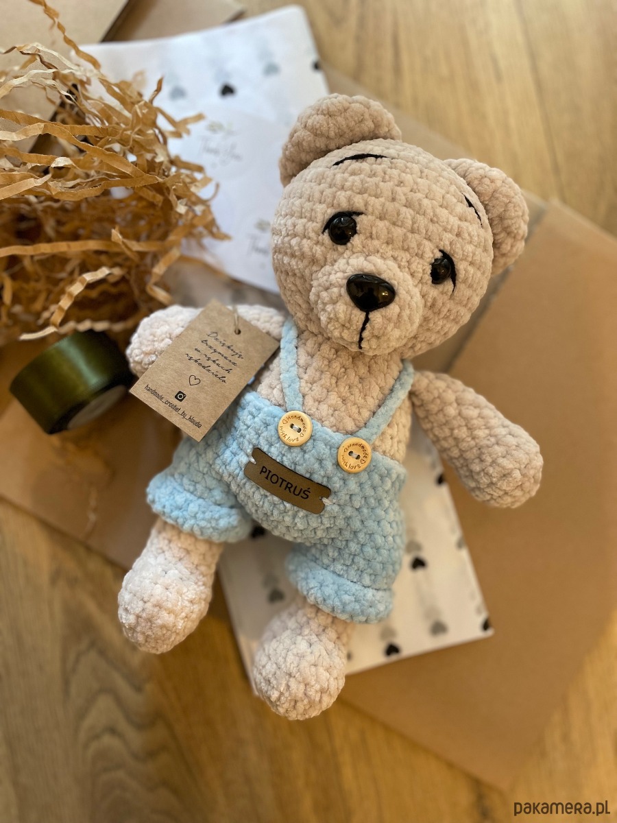 Pluszowy miś przytulanka w niebieskich spodenkach. Wykonany z miłej w dotyku włóczki Himalaya Dolphin Babyc posiada bezpieczne oczka oraz wypełnienie kulka silikonowa.
