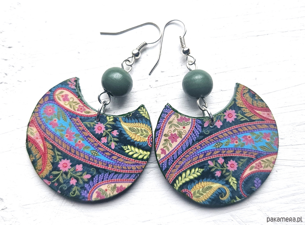 Kolczyki drewniane ozdobione metodą decoupage, dwustronne, starannie wykończone farbami akrylowymi i zabezpieczone wielokrotnie lakierem, koraliki drewniane, bigle posrebrzane, długość kolczyków bez bigli: 6 cm, średnica: 4 cm, bardzo lekkie