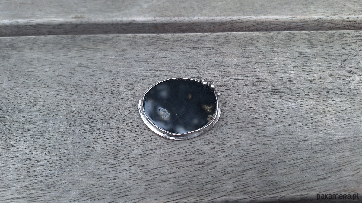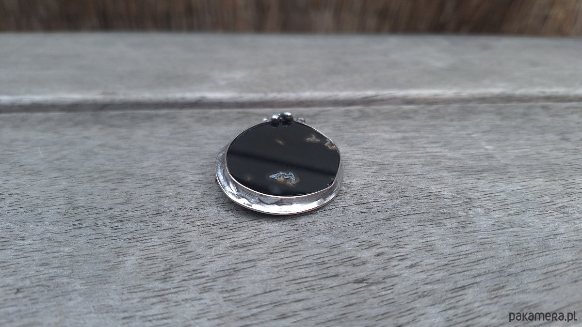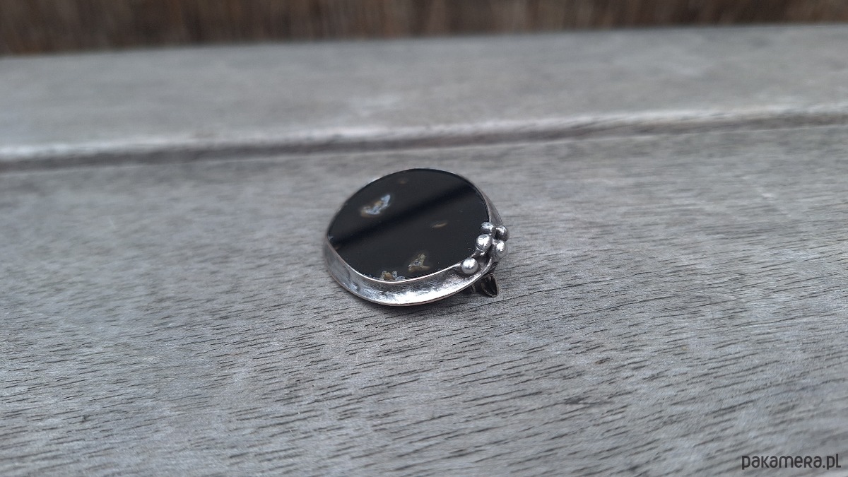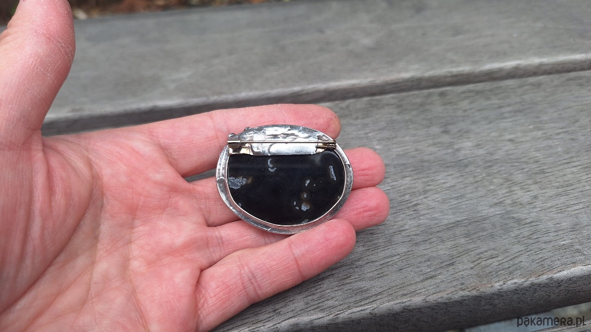 Broszka wykonana z miedzi, cyny i agatu. Wymiary ok. 4.5 na 3.5 m. Zapięcie metalowe.