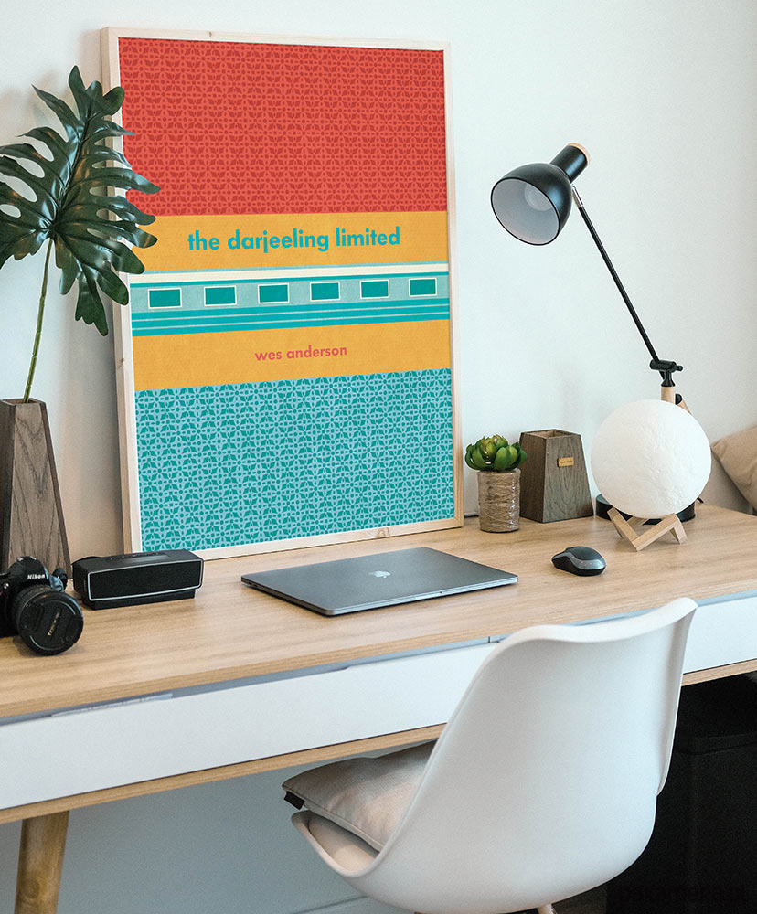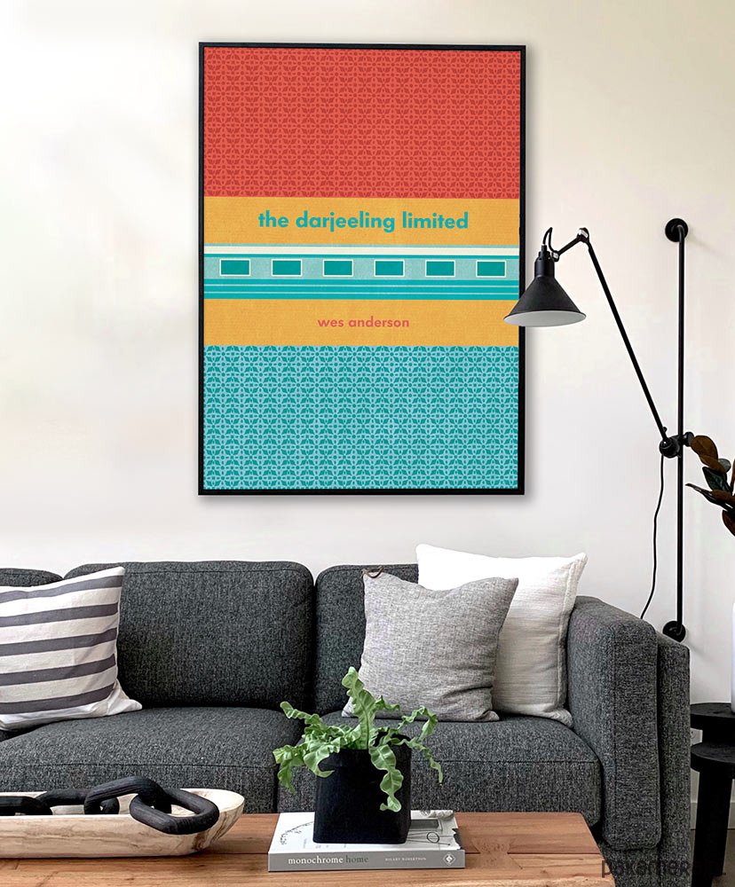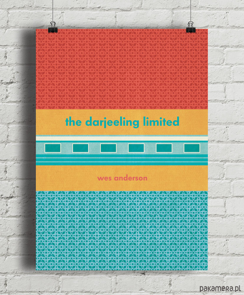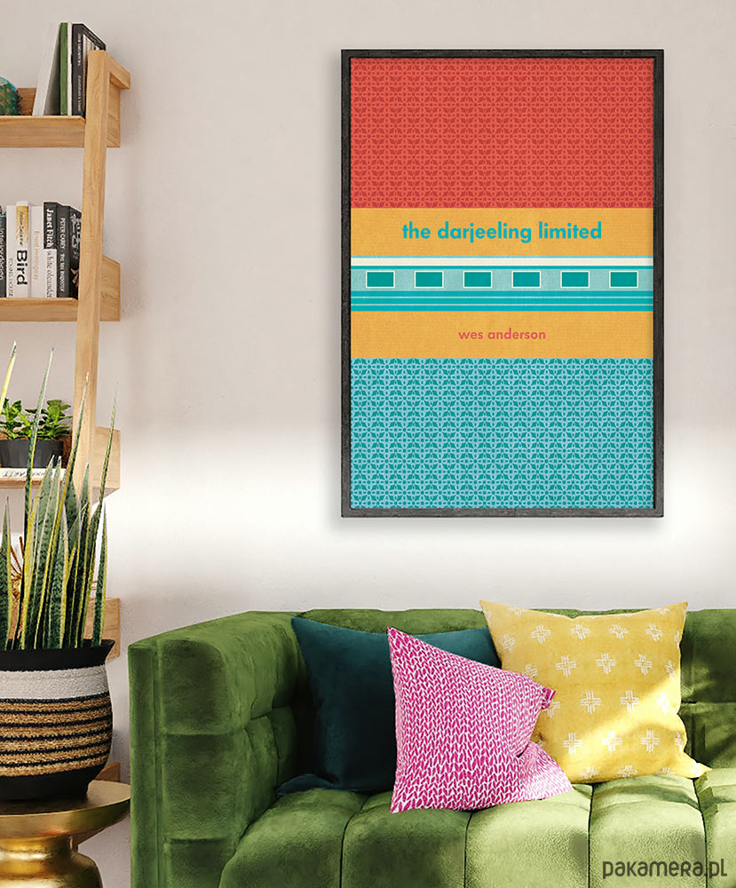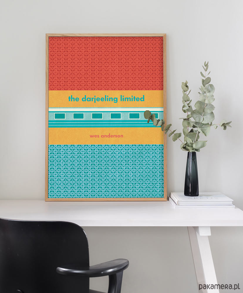 Plakat z autorską grafiką inspirowany filmem Pociąg do Darjeeling (The Darjeeling Limited), reż. Wes Anderson. Na plakacie znajdziecie odwzorowane wzory z przedziału pociągu, jak i sam pociąg "pędzący" przez sam środek grafiki.