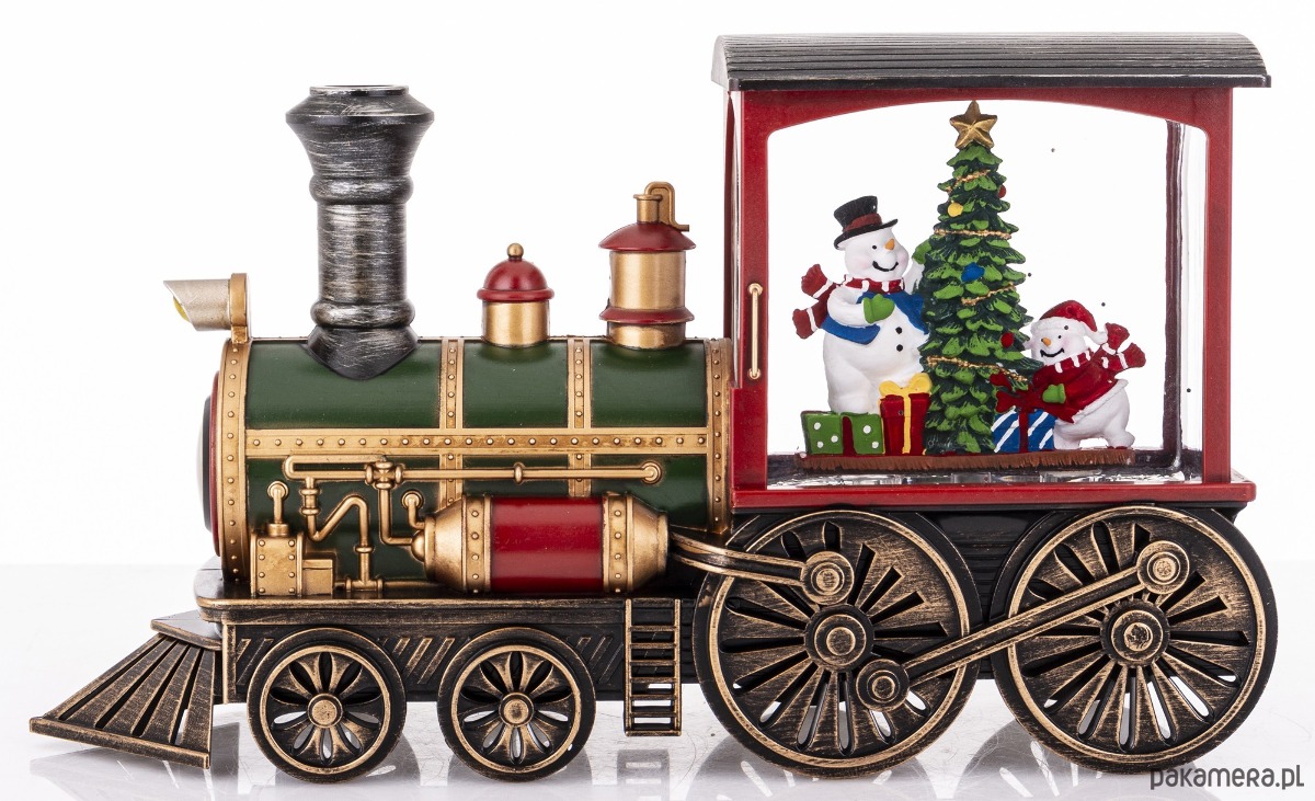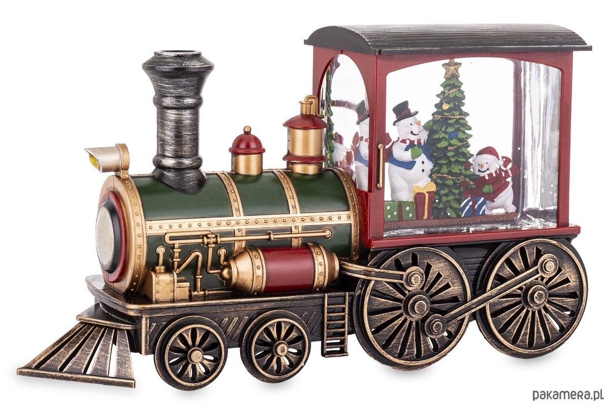Piękna dekoracja świąteczna - kolorowa lokomotywa wykonana została z tworzywa sztucznego i utrzymana w stylu retro. W przeszklonej części choinka i bałwanki przyciągają wzrok. Gdy stoi na parapecie, regale lub komodzie, lokomotywa zachwyci nie tylko dzieci ale i dorosłych. Oświetlona lampkami LED oraz wygrywająca 8 melodii będzie wspaniałą dekoracją świąteczną.