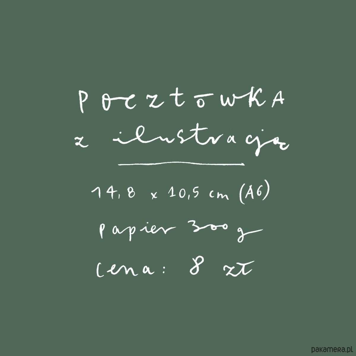 Każda z pocztówek zawiera moją autorską ilustrację i nadaje się do przesłania komuś miłych słów, zaznaczenia czytanej strony w książce, przypięcia magnesem na lodówce czy oprawienia w małą ramkę.