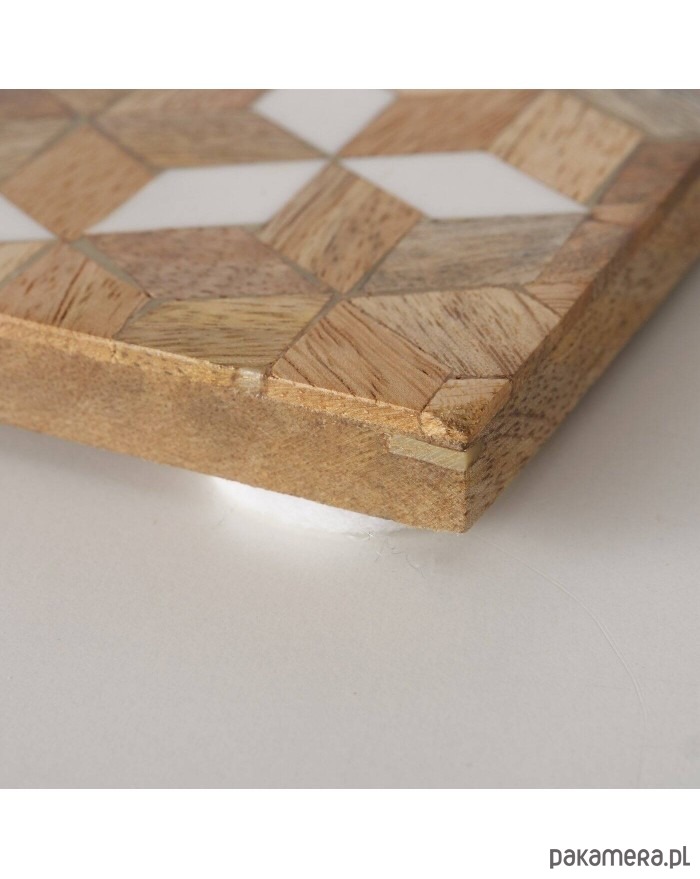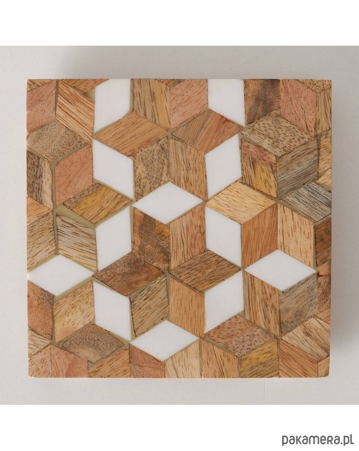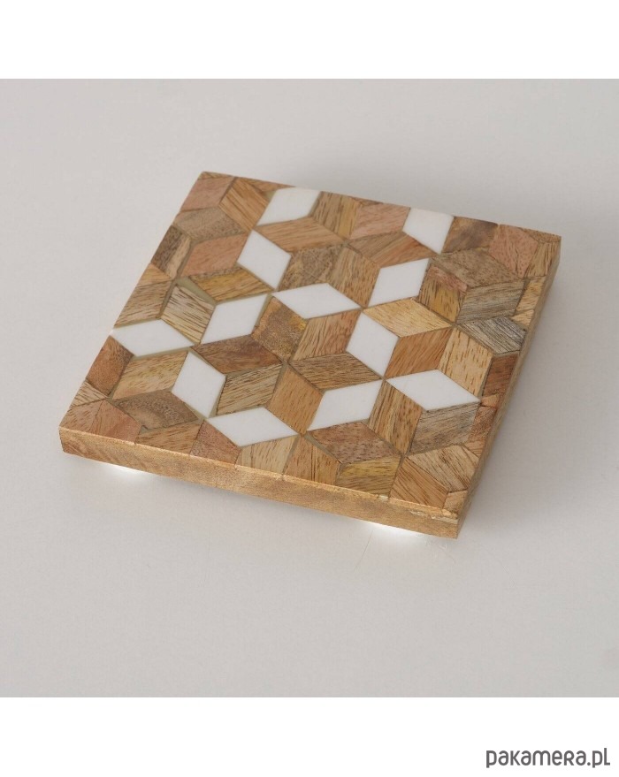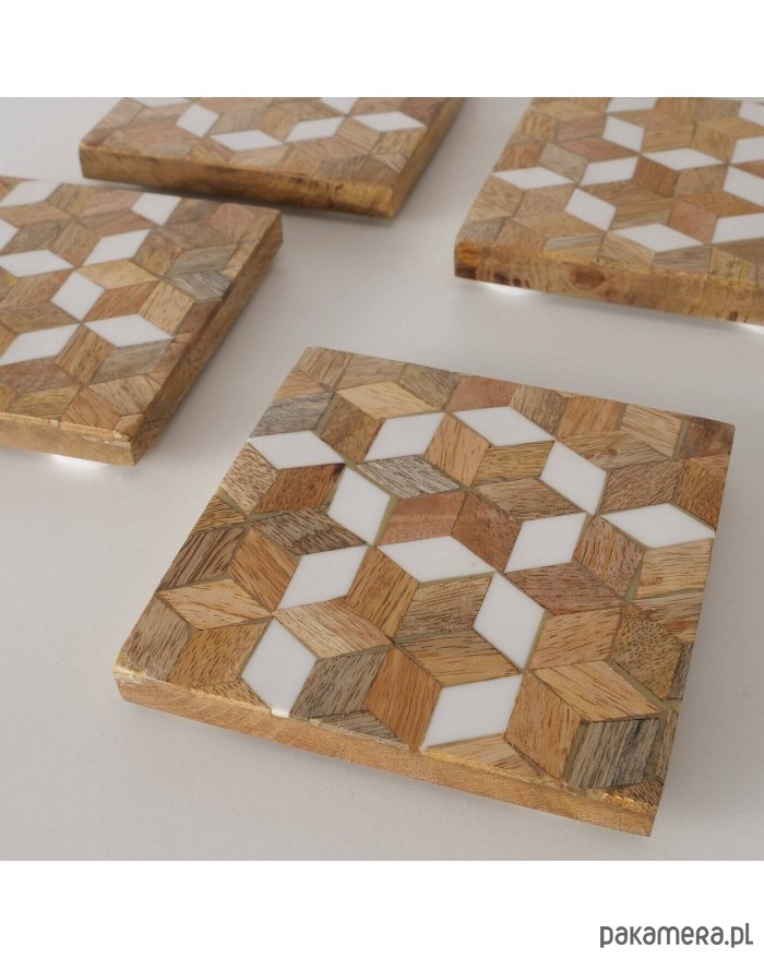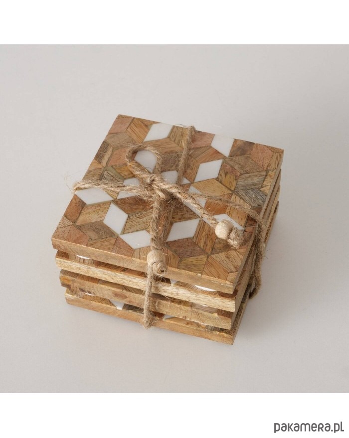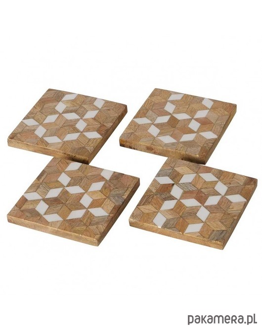 Komplet podstawek pod kubki składający się z 4 sztuk został wykonany z drewna mango. Ozdobione mozaikowym wzorem będzie się ładnie prezentował na stoliku.