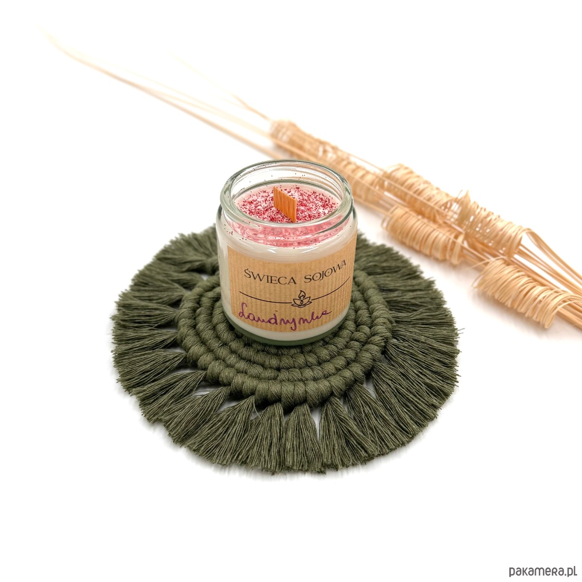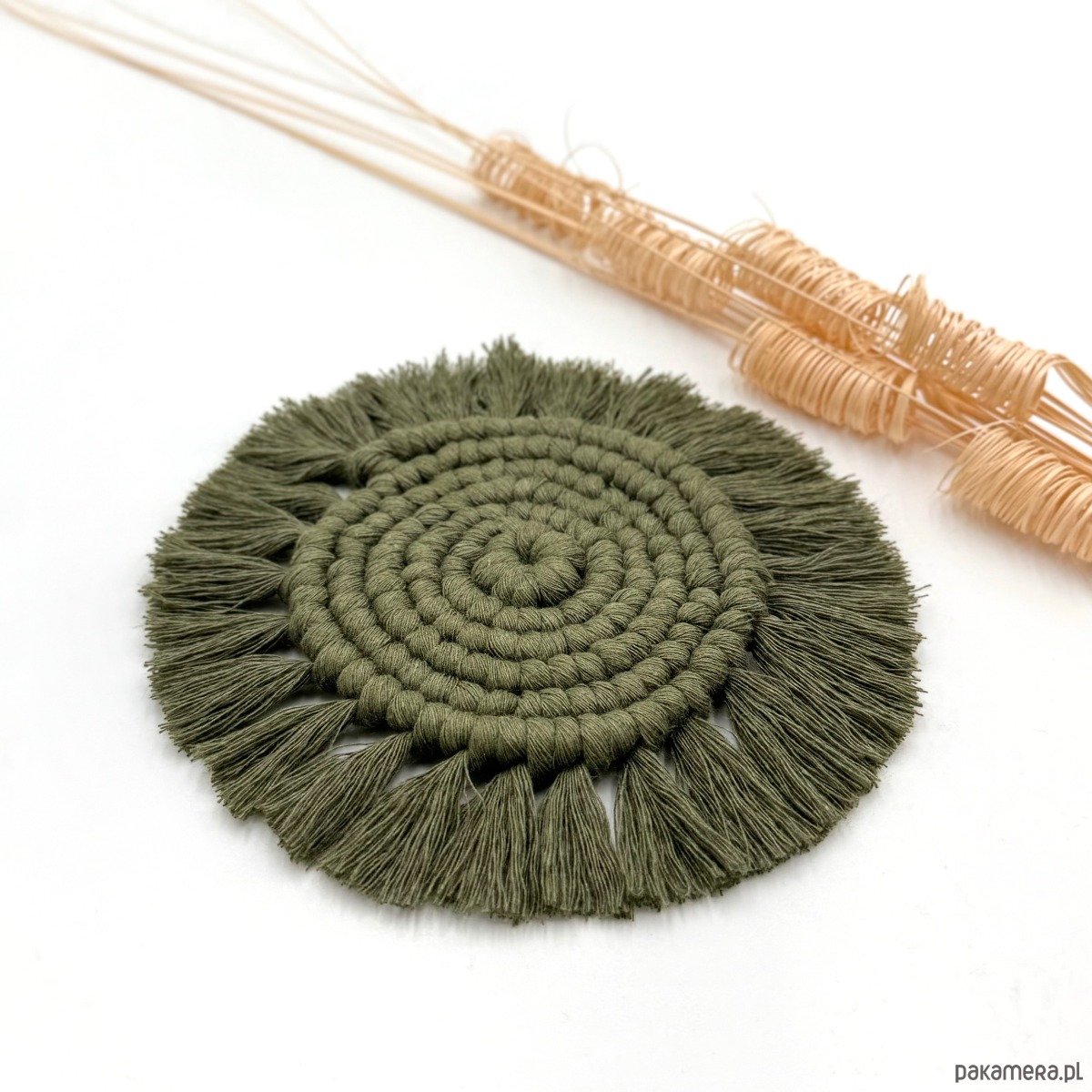 Podkładka makramowa w kolorze zielonym, idealna pod świece, kominki zapachowe, kubki, wazony czy doniczki. Świetna ozdoba dla miłośników stylu boho.