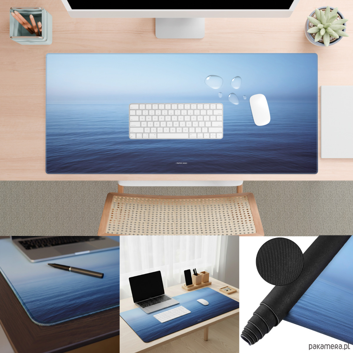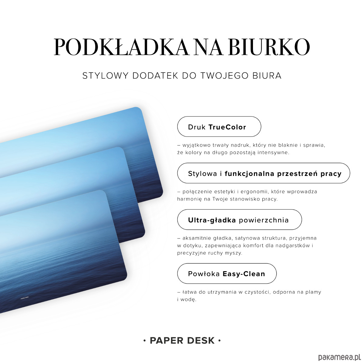 Podkładka na biurko Deep to elegancka mata inspirowana spokojem głębokiej wody i naturalnymi, płynnymi formami. Subtelna, harmonijna grafika wprowadza do przestrzeni pracy poczucie równowagi i koncentracji, tworząc estetyczne tło dla codziennych zadań.