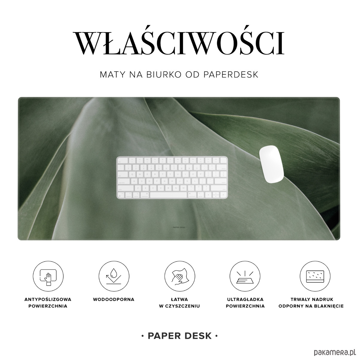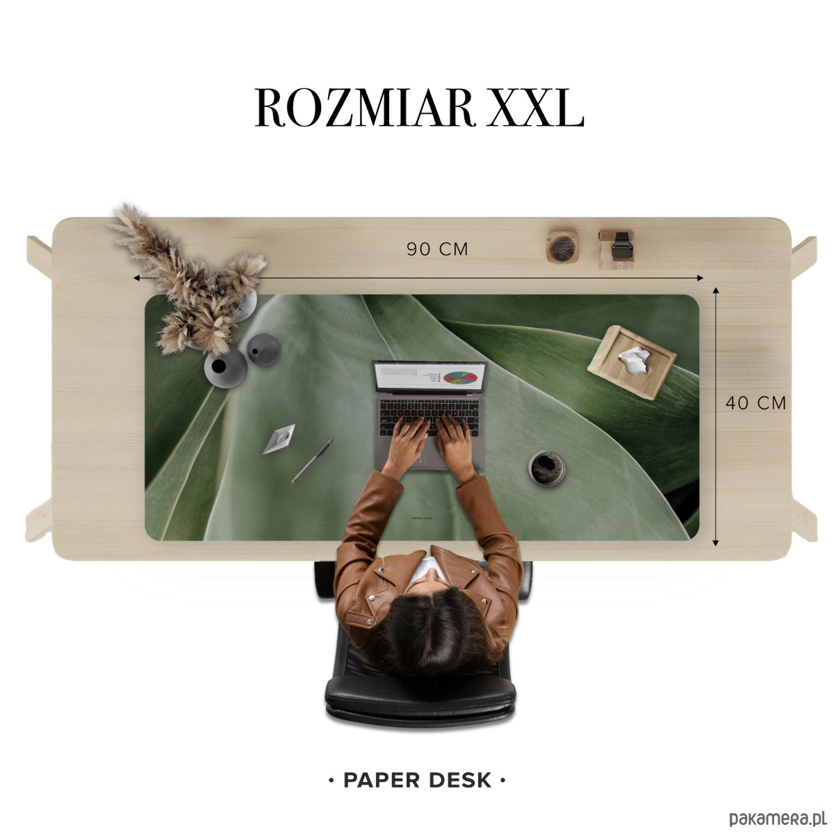 description dropdown: Design inspirowany naturąPodkładka Growth czerpie inspirację z liści i roślin – ich siły, rytmu i delikatności. Wprowadza do przestrzeni spokój i harmonię, pomagając zachować balans między pracą a odpoczynkiem. Jej naturalny kolor uspokaja i ułatwia koncentrację.Kolekcja Essence – blisko naturyEssence to kolekcja PaperDesk inspirowana żywiołami natury – piaskiem, kamieniem, lawą i zielenią. Podkładka Growth symbolizuje wzrost, świeżość i nową energię. Doskonale komponuje się z pl
