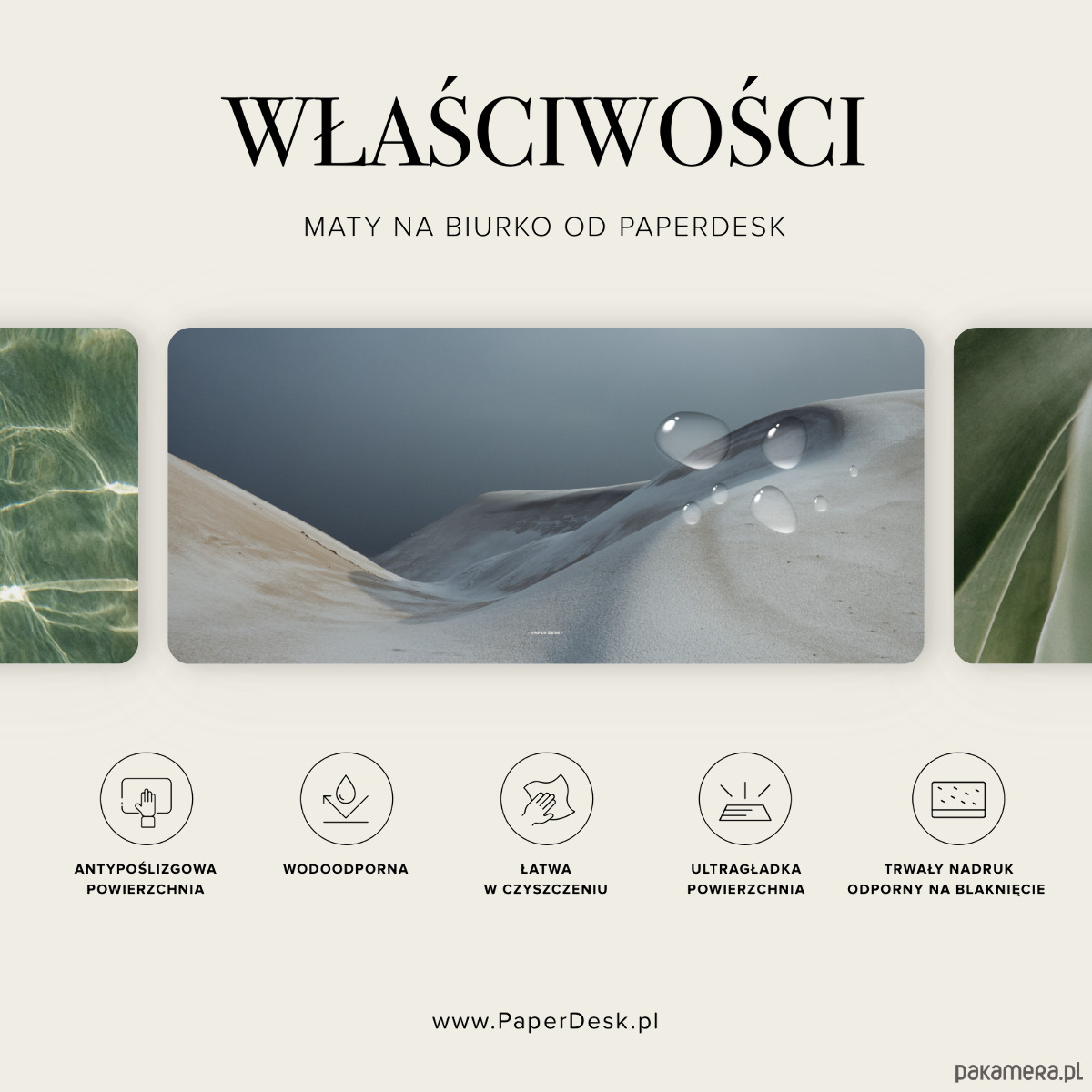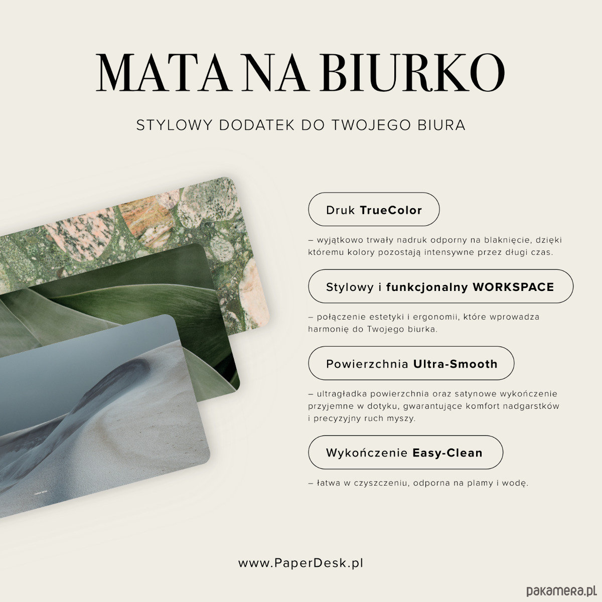 description dropdown: Design inspirowany kamieniemPodkładka Stone czerpie inspirację z natury – z faktury i siły kamienia. Jej stonowany odcień wprowadza równowagę i porządek do przestrzeni pracy. To produkt dla tych, którzy cenią ciszę, spokój i ponadczasowy minimalizm.Kolekcja Essence – spokój natury w Twojej przestrzeniKolekcja Essence to połączenie naturalnych inspiracji i prostych form. Podkładka Stone symbolizuje stabilność i wewnętrzną siłę – to codzienny towarzysz pracy, który porządkuje myśli i przestrzeń. Doskonale ko