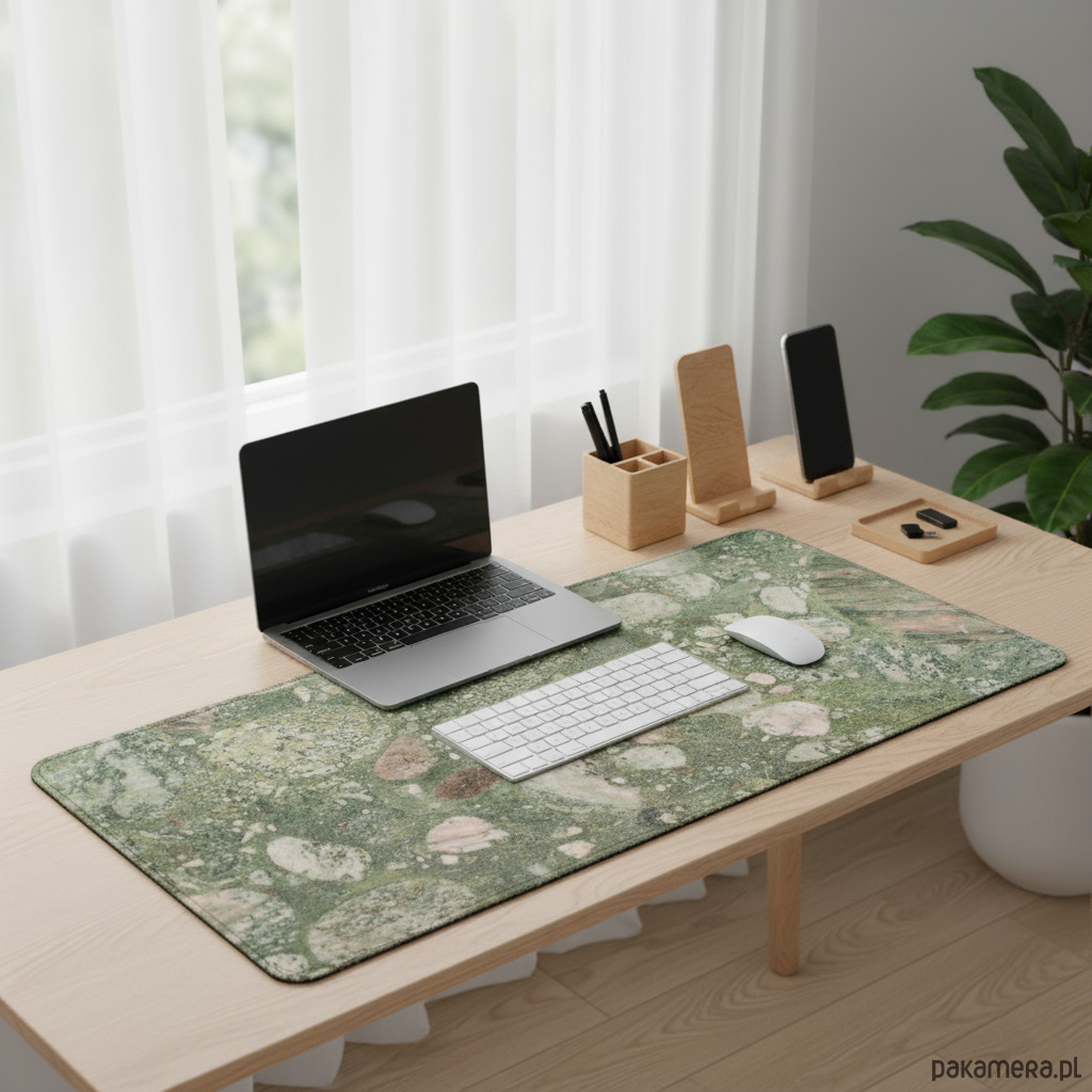 Podkładka na biurko – siła i równowaga inspirowana kamieniem. Podkładka Stone 90×40 cm z kolekcji Essence to minimalistyczny dodatek, który nadaje przestrzeni pracy spokój i klarowność. Kamienny wzór inspirowany naturą pomaga utrzymać skupienie i porządek w codziennych zadaniach. To funkcjonalna podkładka na biurko pod komputer, laptop i planer, która chroni blat, wygłusza dźwięki i wprowadza do biurka wyrafinowaną prostotę.