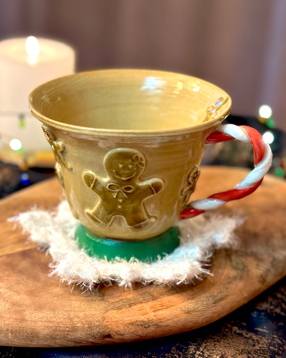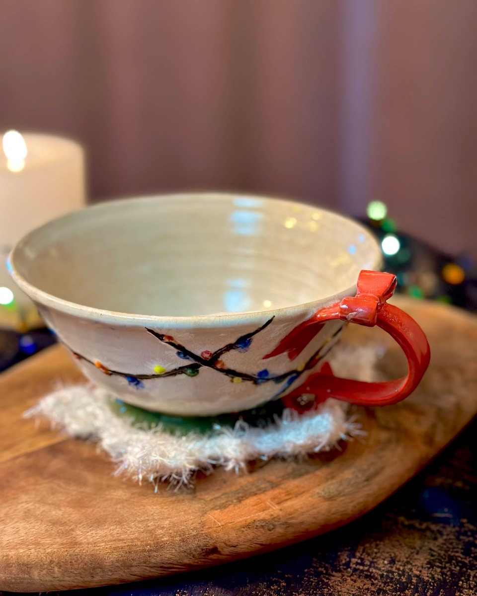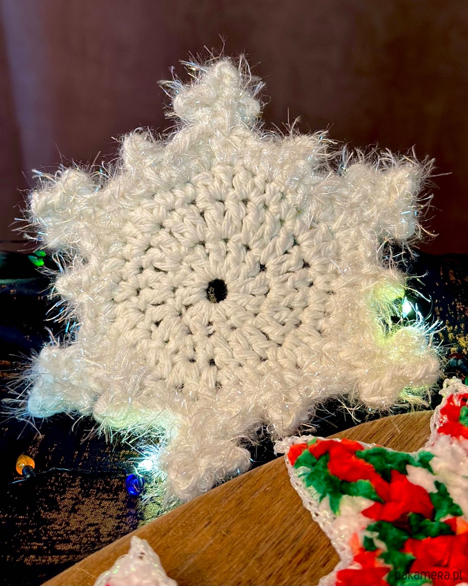 Ręcznie dziergana podkładka pod kubek z trwałego sznurka z dodatkiem opalizujących iskierek to świetne uzupełnienie świątecznego prezentu.