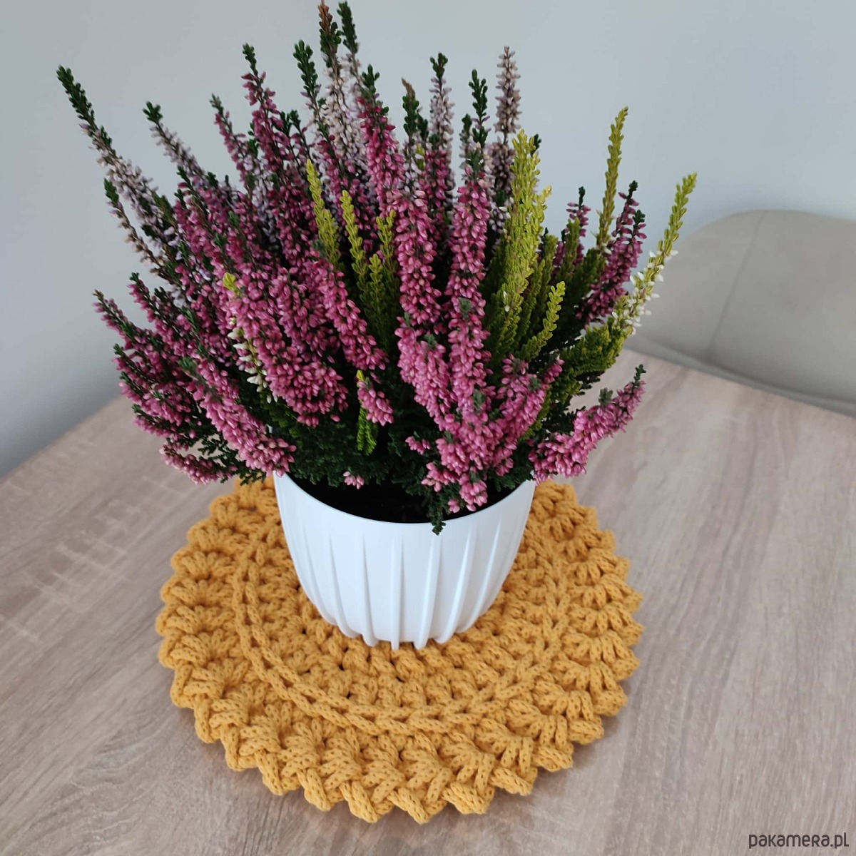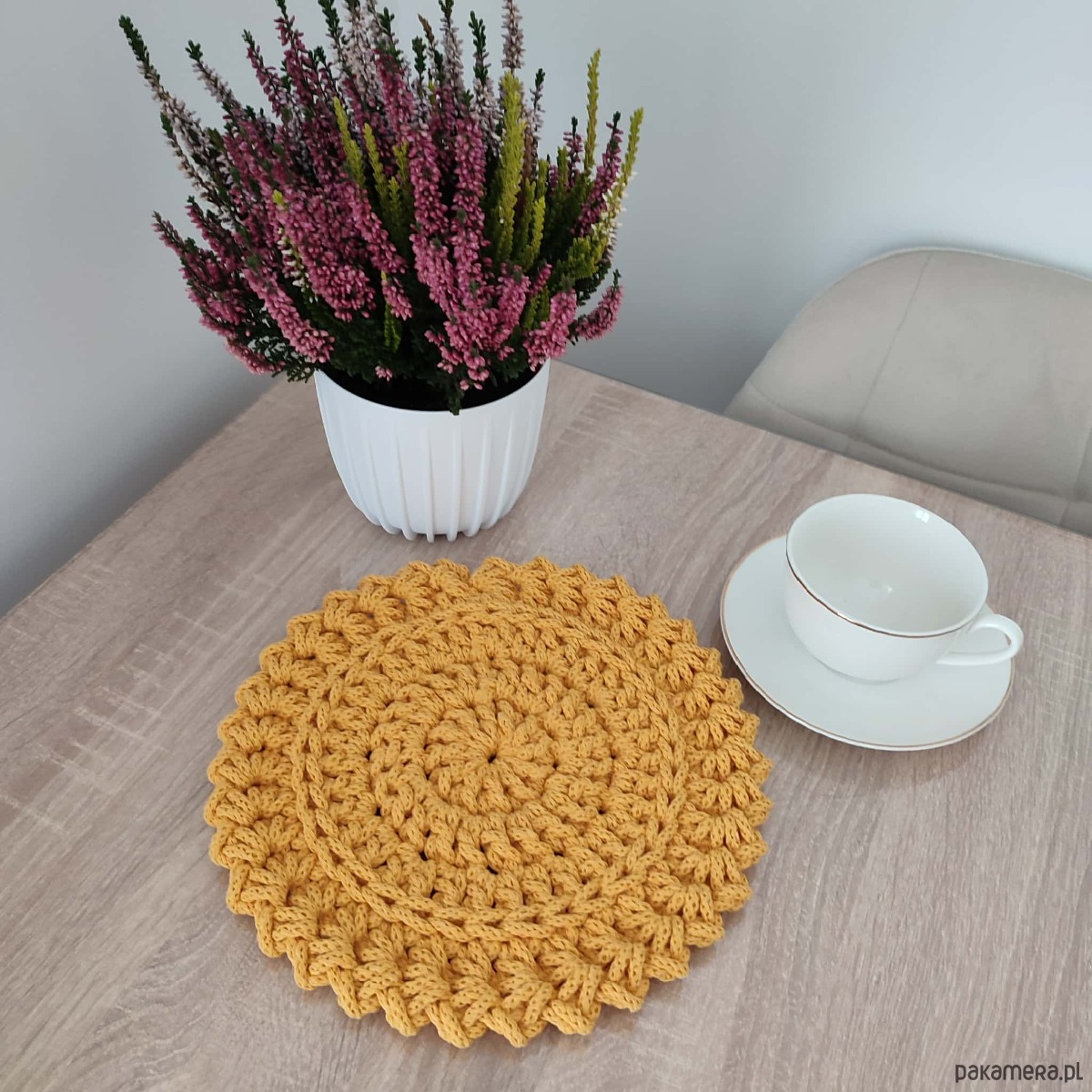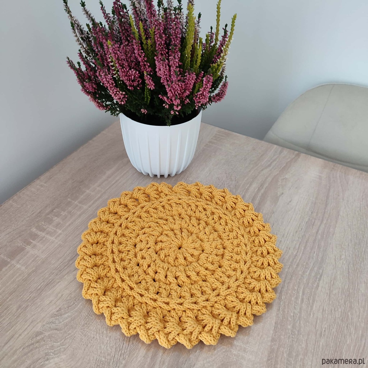 Podkładka o średnicy 26cm, wykonana metodą szydełkowania z polskiego sznurka bawełnianego 5mm.