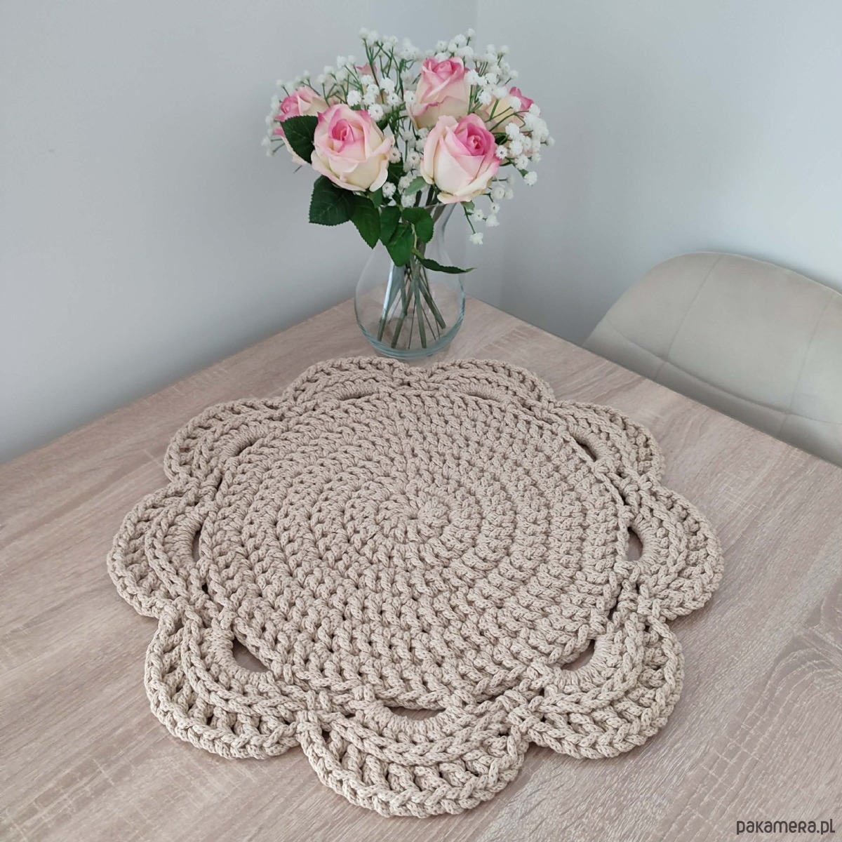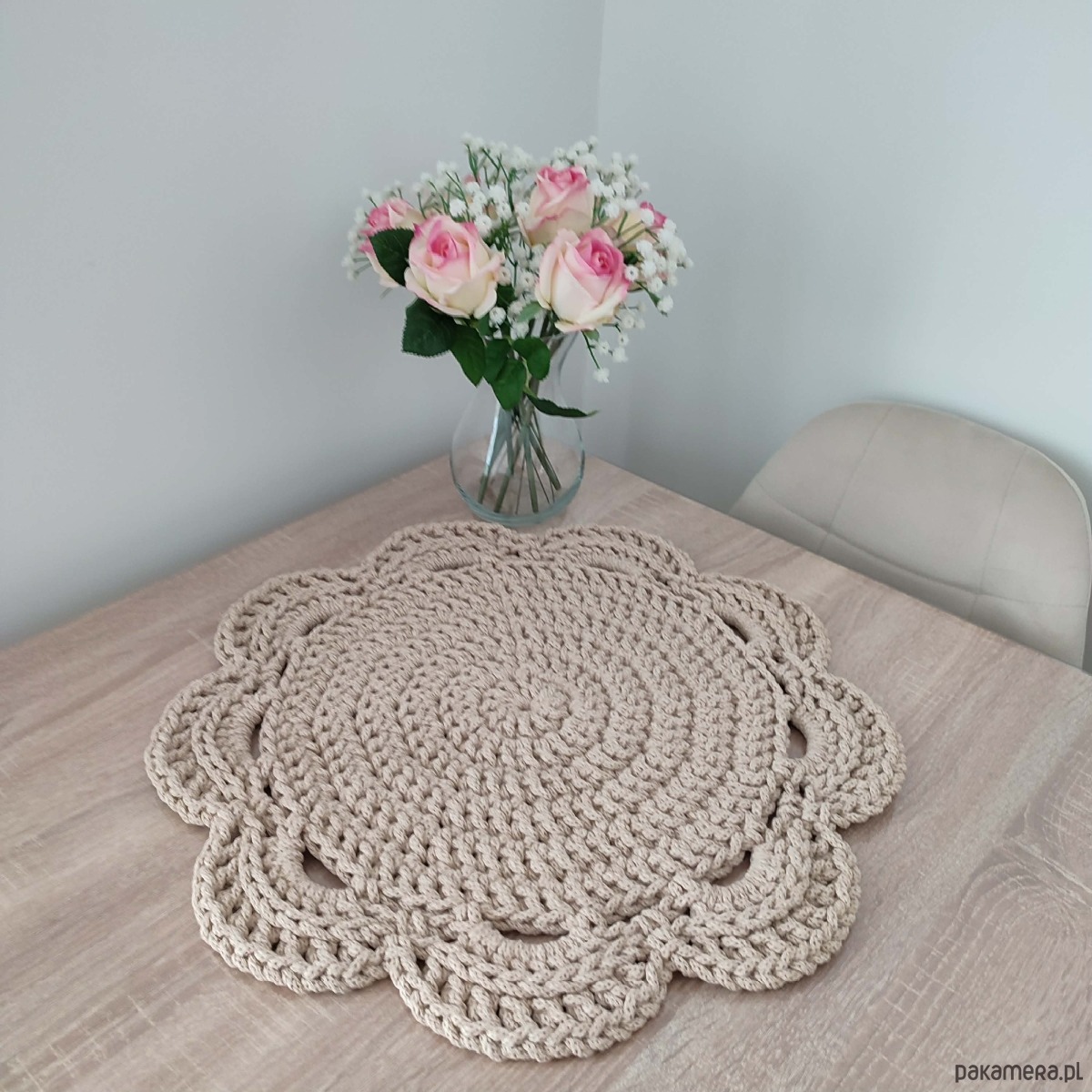 Podkładka o średnicy 50cm, wykonana metodą szydełkowania z polskiego sznurka bawełnianego 5mm.