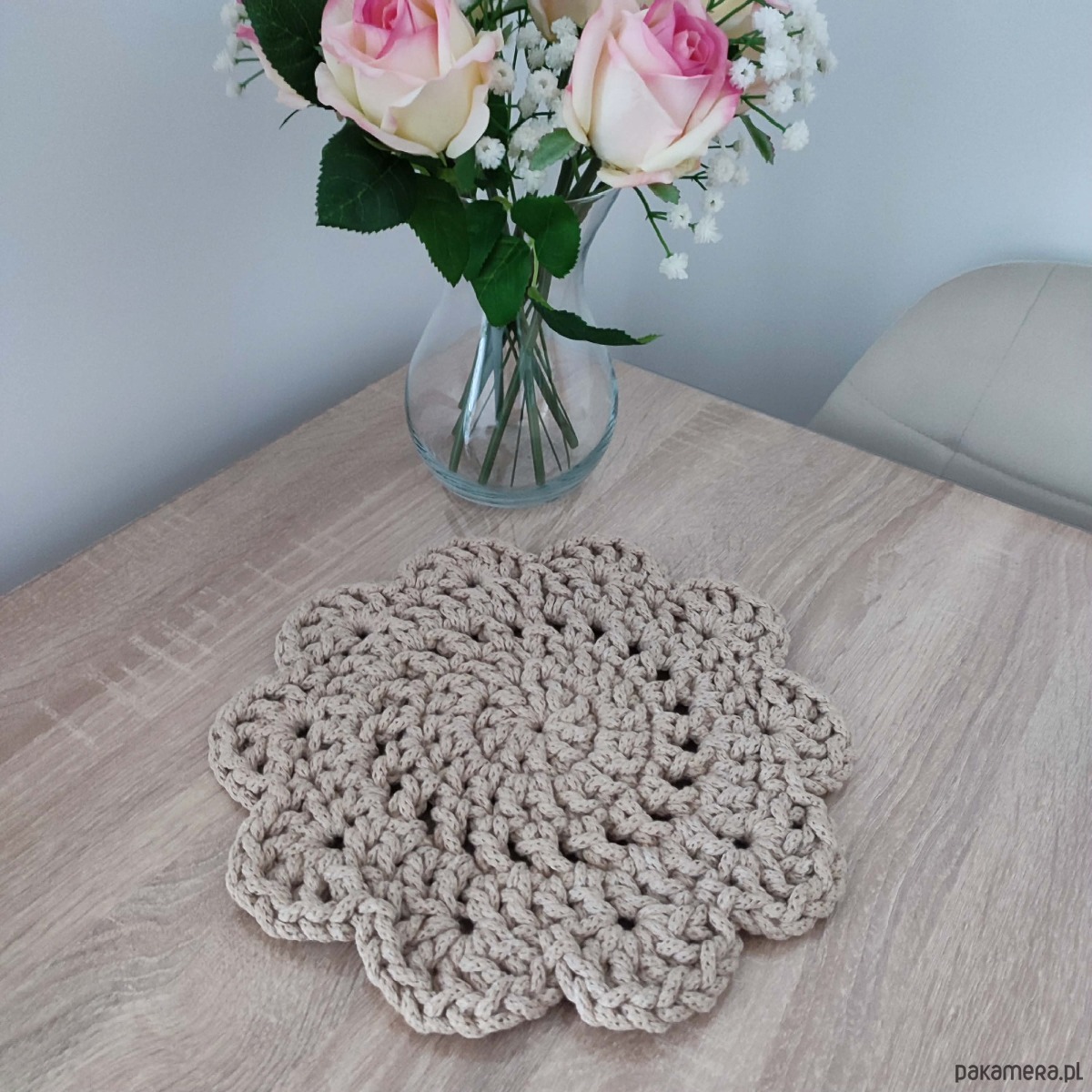 Podkładka o średnicy 27cm, wykonana metodą szydełkowania z polskiego sznurka bawełnianego 5mm.