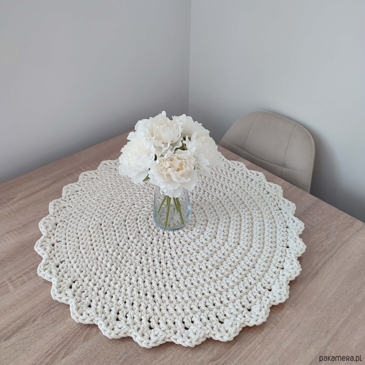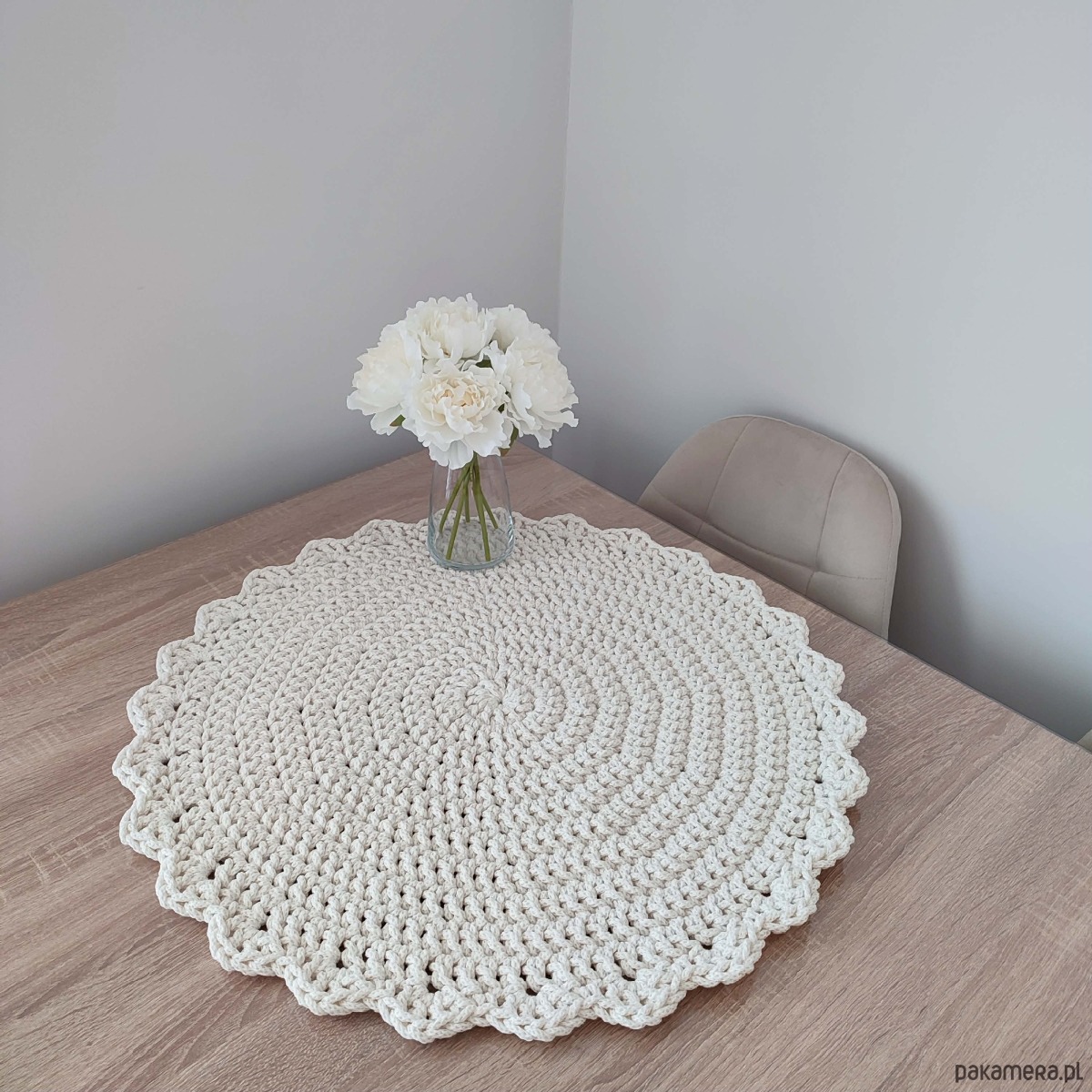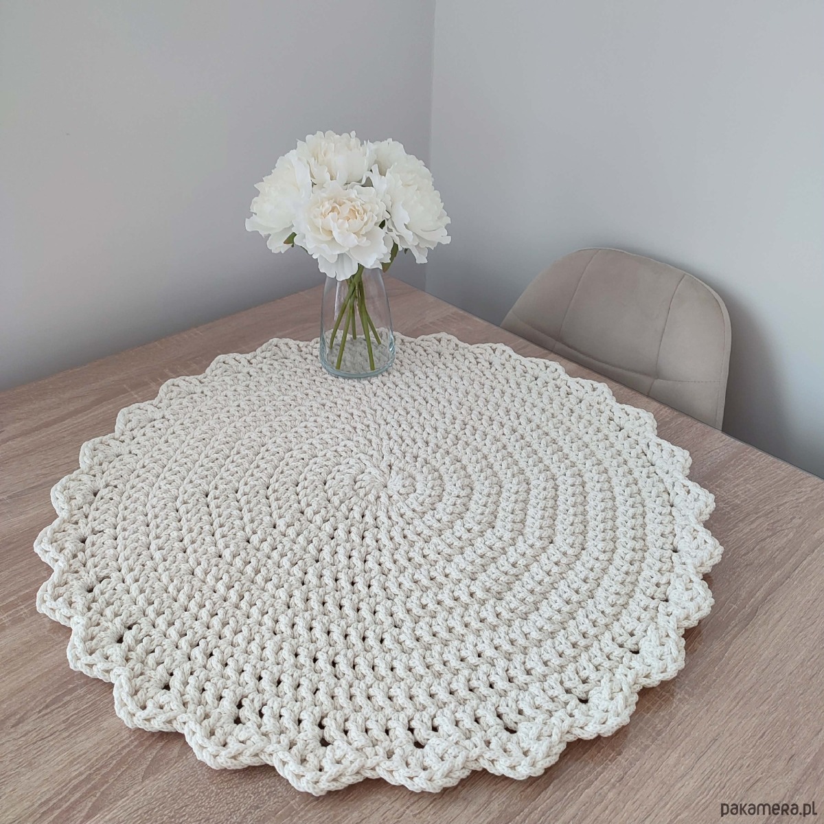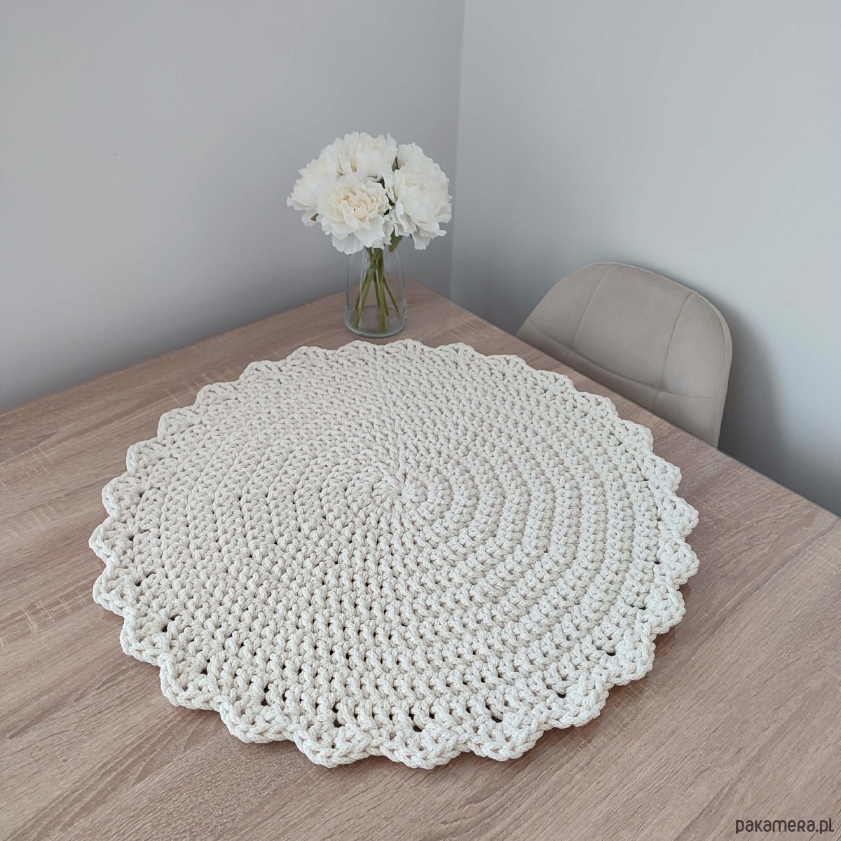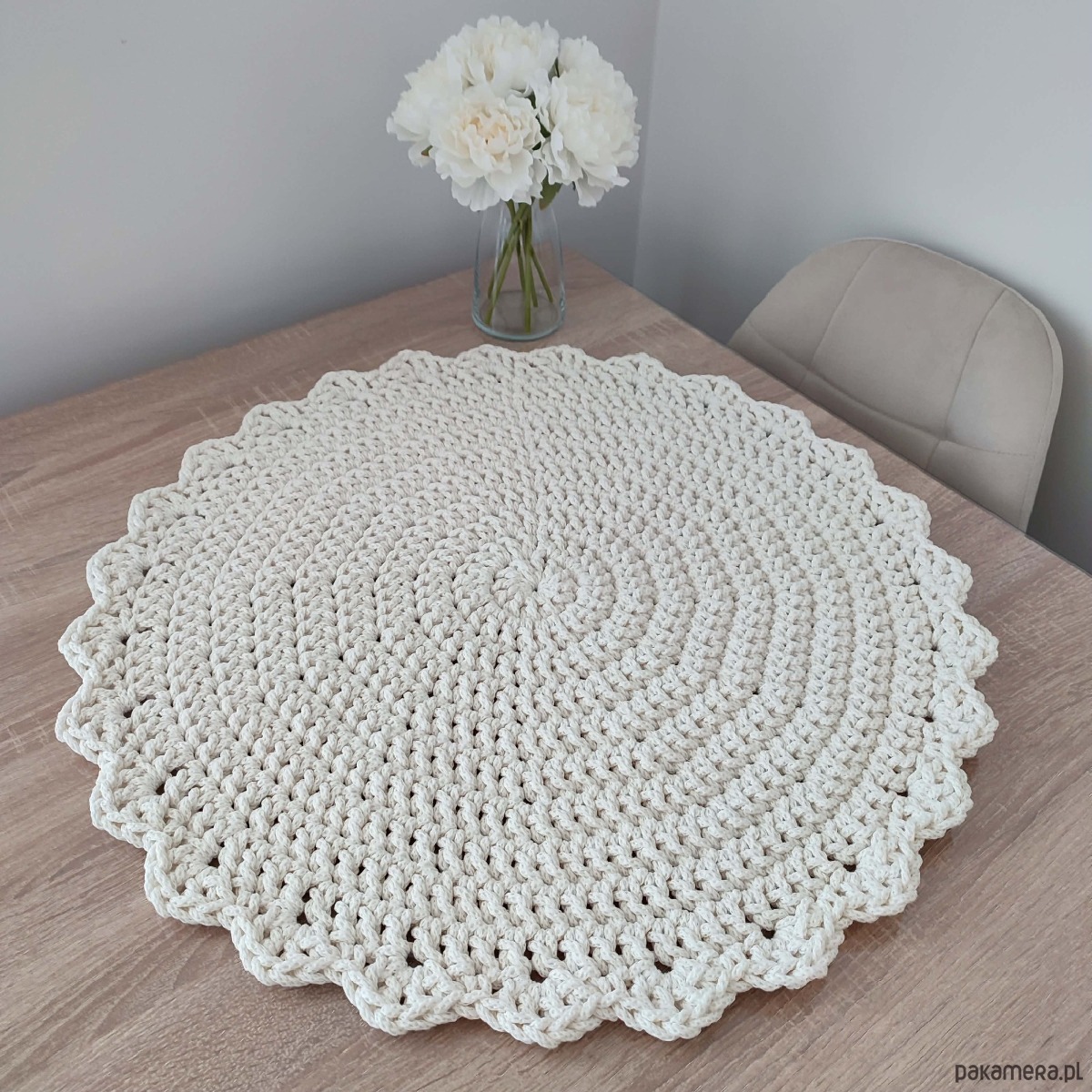 Podkładka o średnicy 60cm, wykonana metodą szydełkowania z polskiego sznurka bawełnianego 5mm.