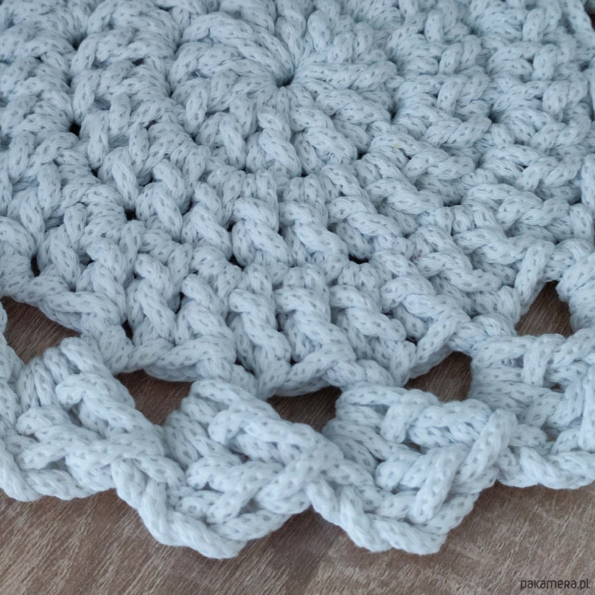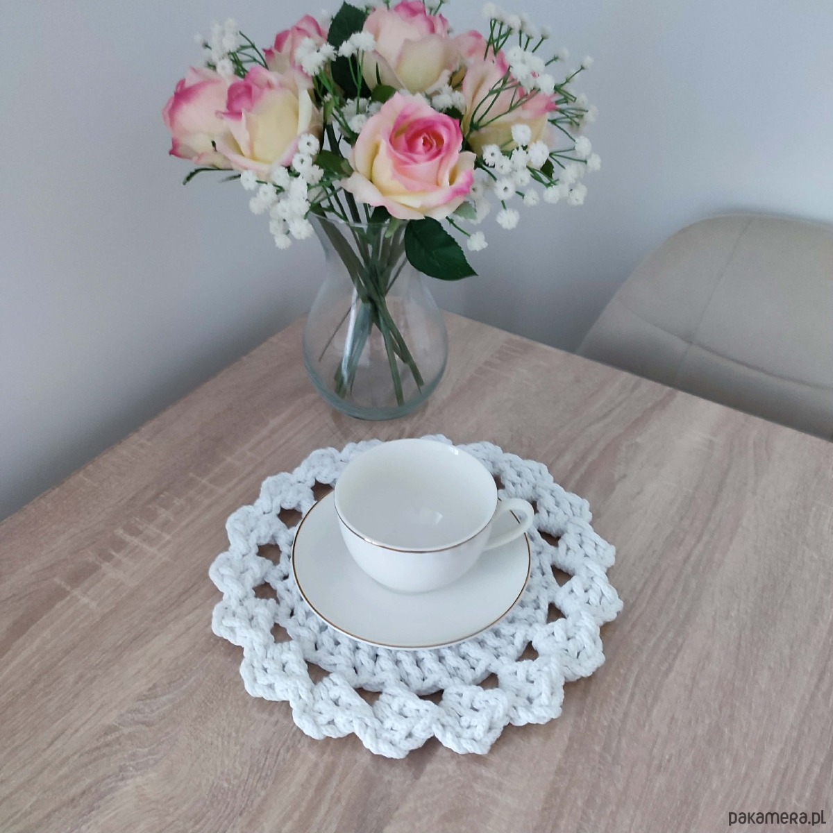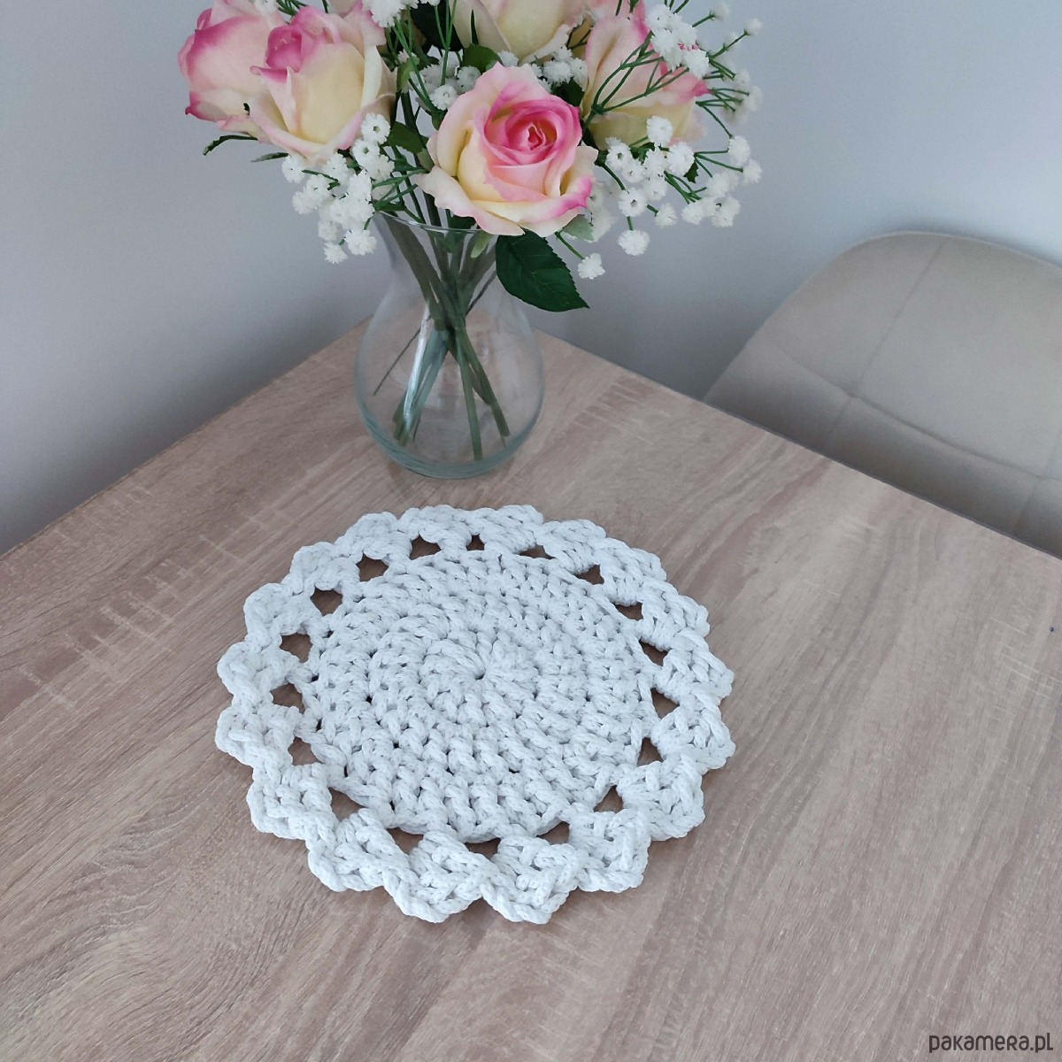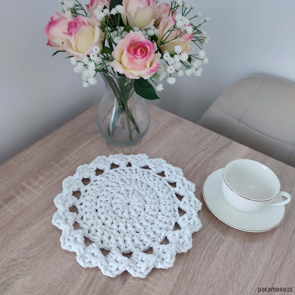 Podkładka o średnicy 26cm, wykonana metodą szydełkowania z polskiego sznurka bawełnianego 5mm.