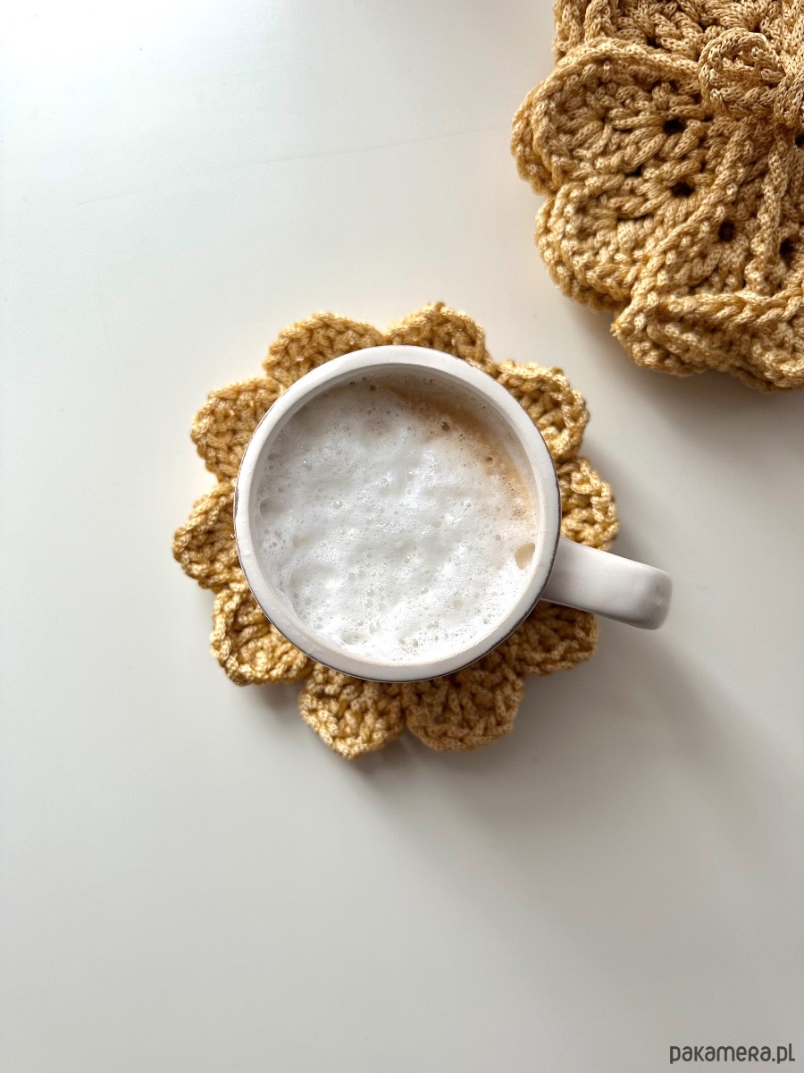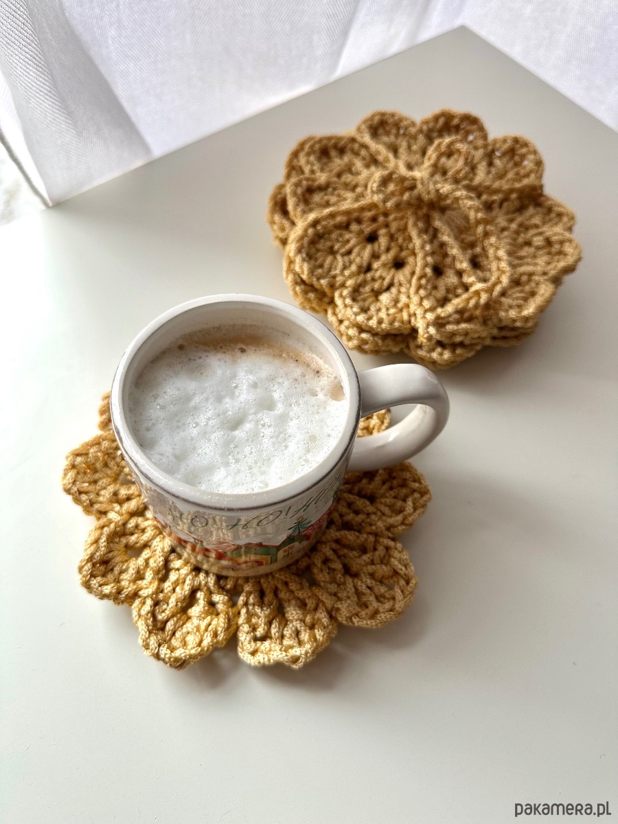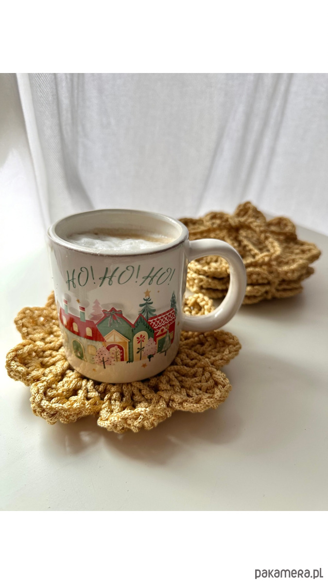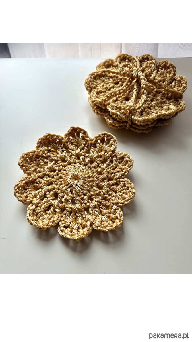 Zestaw zawiera 4 sztuki złotych podkładek pod duże kubki oraz małe miseczki ✨