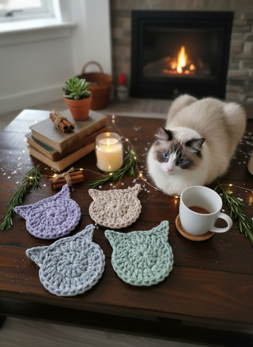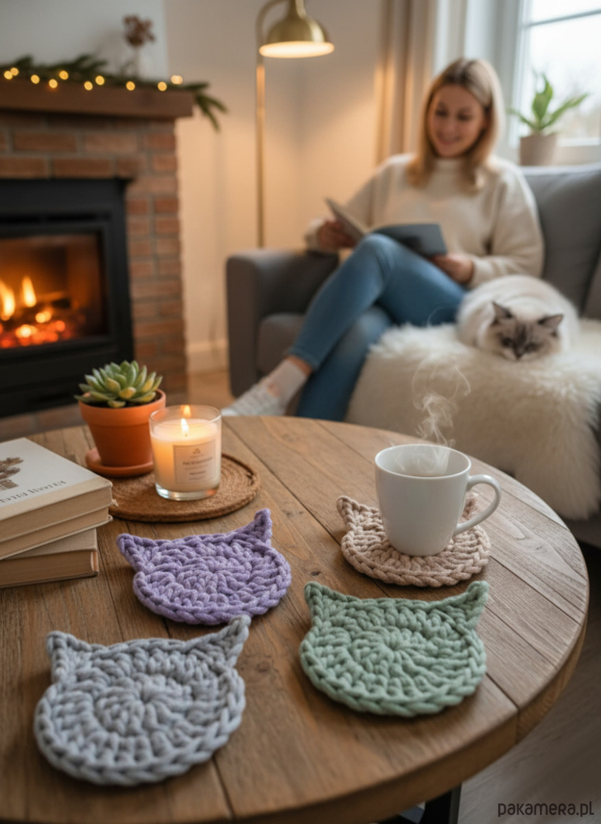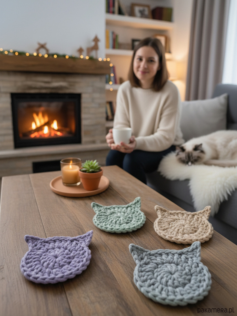 Każda podkładka ma swoje małe „kocie uszka” i własny kolor, dzięki czemu zestaw tworzy pełen wdzięku, niepowtarzalny mix. To rękodzieło z duszą -stworzone w Polsce, z pasji i miłości do detali.