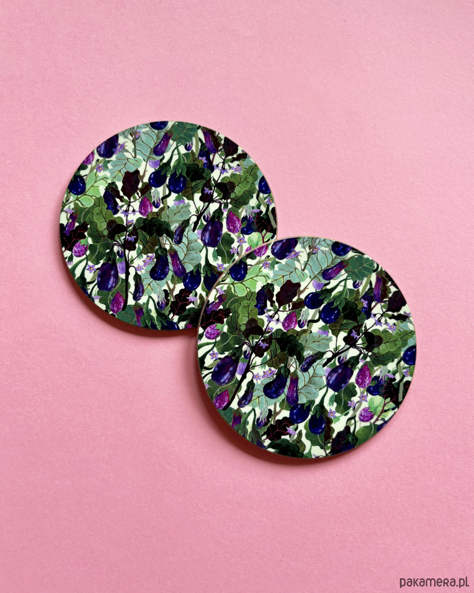 Komplet dwóch błyszczących podkładek pod kubek z autorską ilustracją w bakłażany.