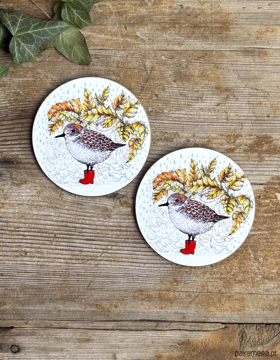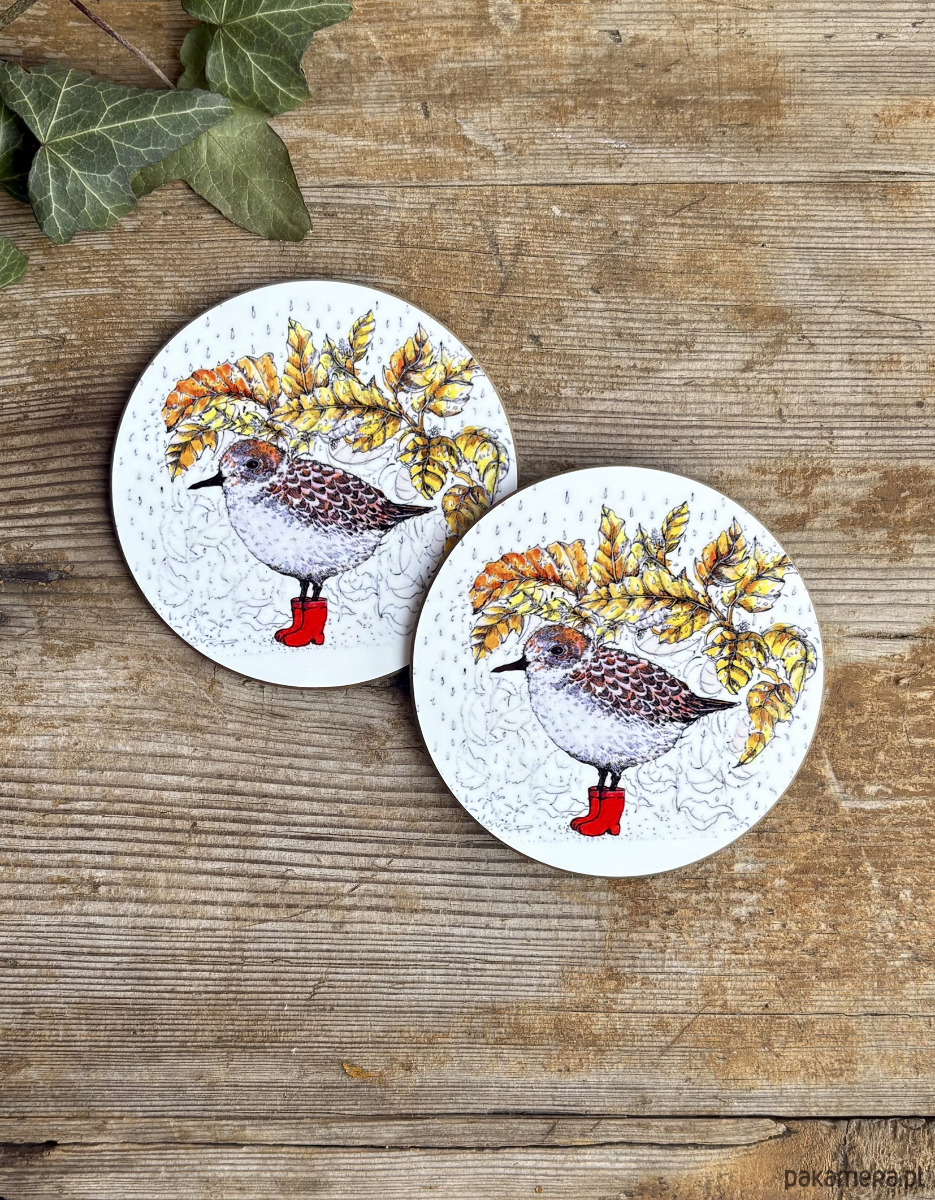 Komplet dwóch błyszczących podkładek pod kubek z autorską ilustracją.