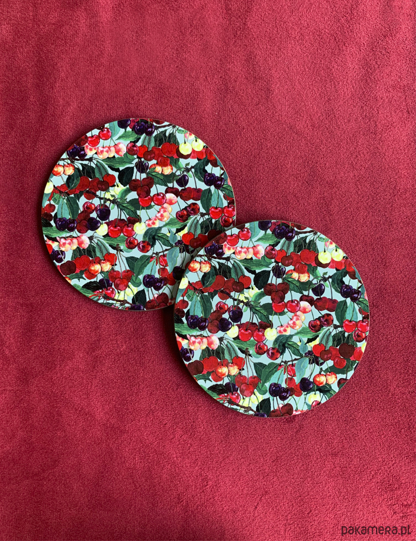 Komplet dwóch błyszczących podkładek pod kubek z autorską ilustracją w czereśnie