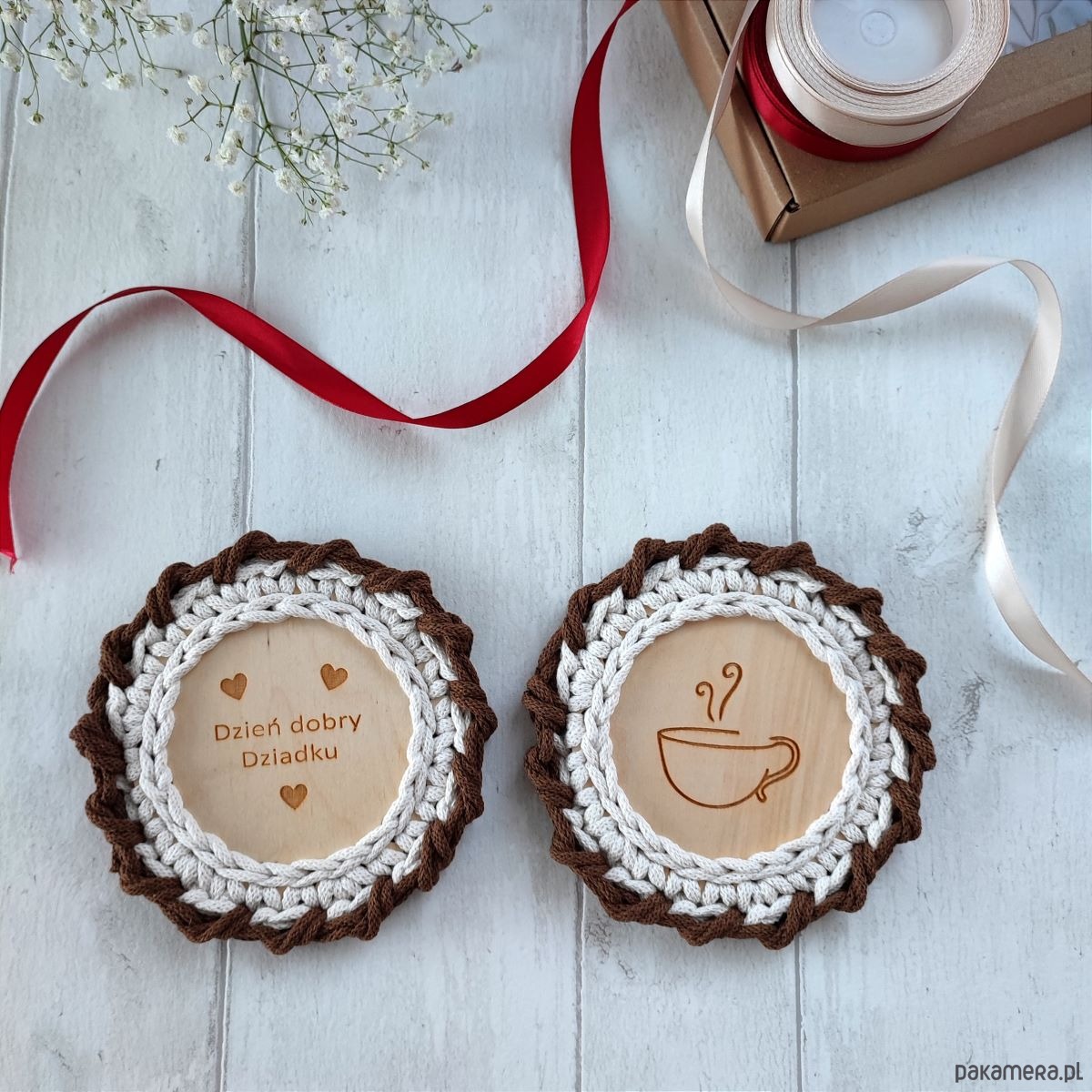 Z okazji zbliżającego się święta naszych kochanych Dziadków, oferuję zestaw 2 podkładek wykonanych ze sznurka bawełnianego 3 mm, na bazie ze sklejki drewnianej.