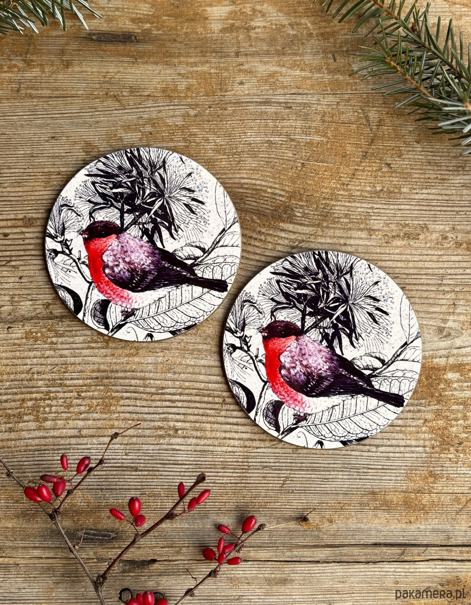 Komplet dwóch błyszczących podkładek pod kubek z autorską ilustracją.