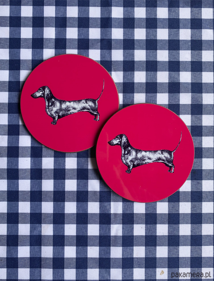 Komplet dwóch błyszczących podkładek pod kubek z autorską jamniczą ilustracją