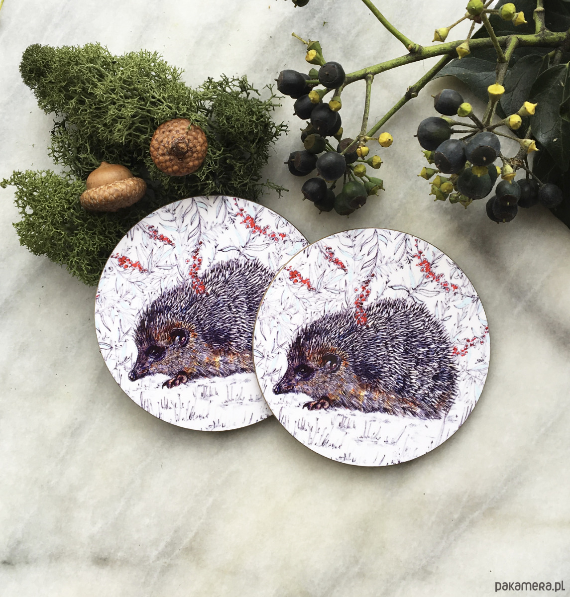Komplet dwóch błyszczących podkładek pod kubek z autorską ilustracją.
