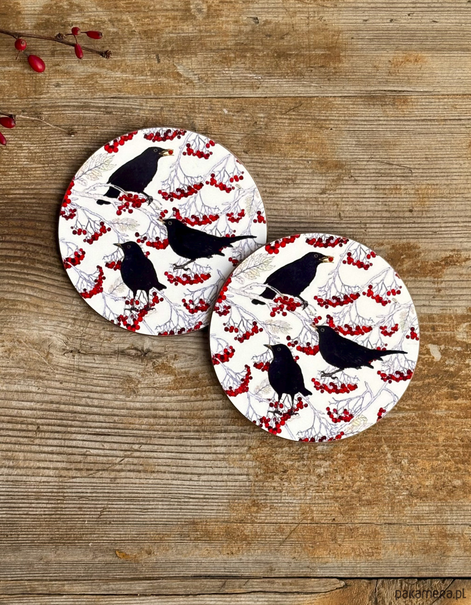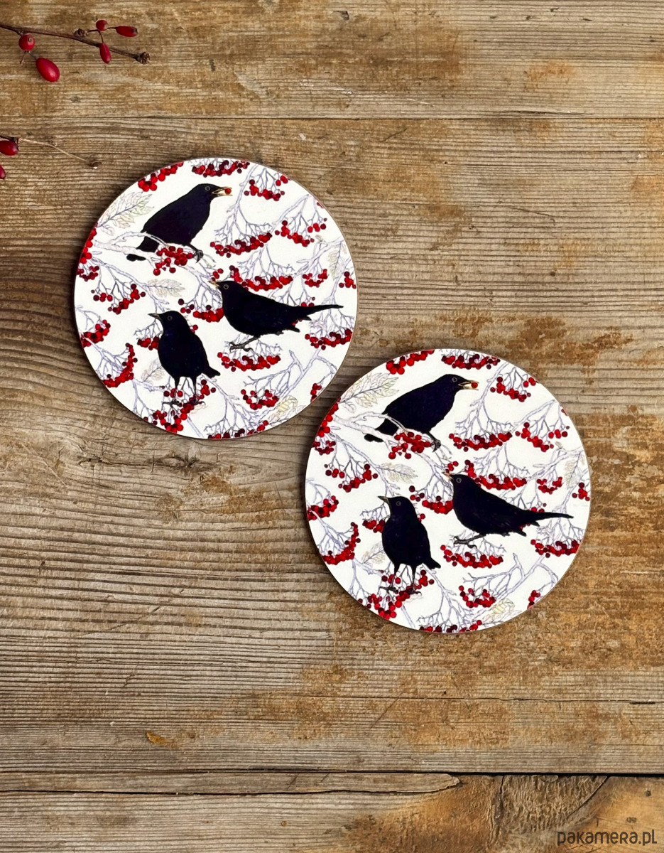 Podkładki pod kubek- Kosy w jarzębinie- Ilustracja- Black birds