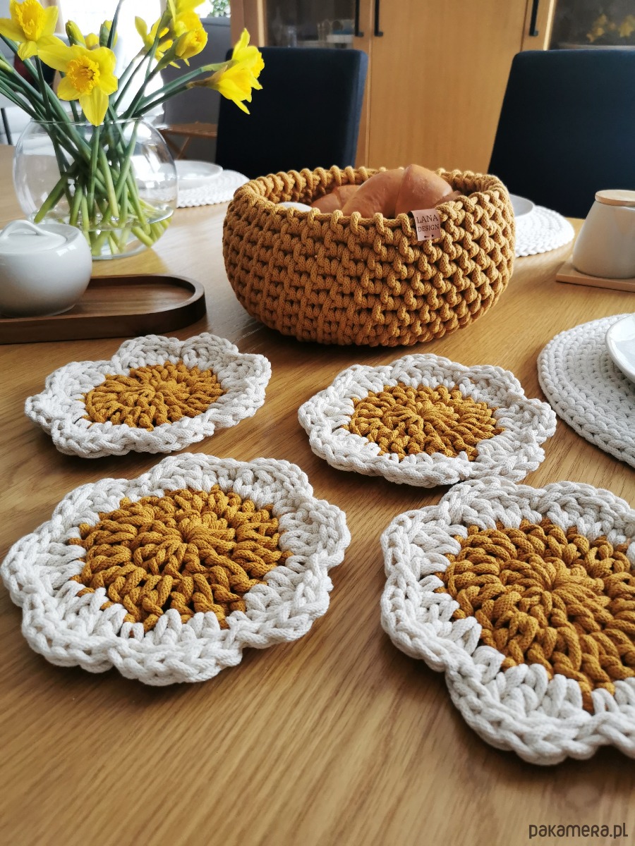Wykonane w 100% z naturalnej bawełny, łączą w sobie funkcjonalność i estetykę. Delikatny, kwiatowy kształt sprawia, że każdy stół nabiera przytulnego, stylowego charakteru — niezależnie od tego, czy pijesz poranną kawę, jesz śniadanie z bliskimi czy organizujesz spotkanie przy stole.