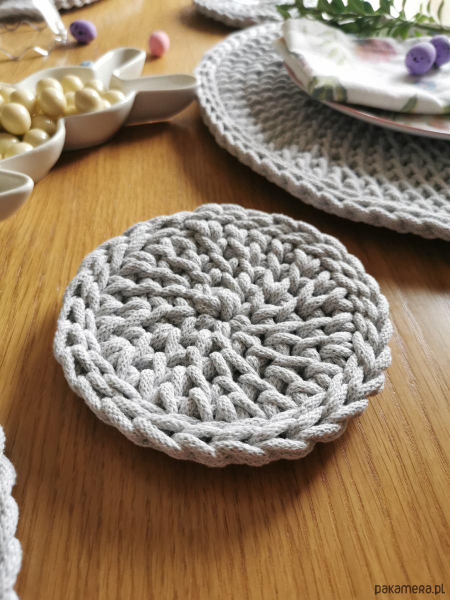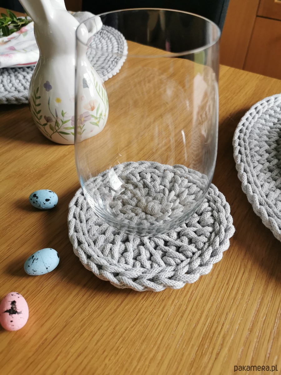 Ten zestaw 6 bawełnianych podkładek pod kubek lub szklankę został stworzony z myślą o codziennych, spokojnych chwilach przy stole. Gęsto pleciony wzór ze sznurka bawełnianego sprawia, że podkładki są solidne i skutecznie chronią blat stołu przed gorącymi napojami, a jednocześnie pozostają miękkie i przyjemne w dotyku.