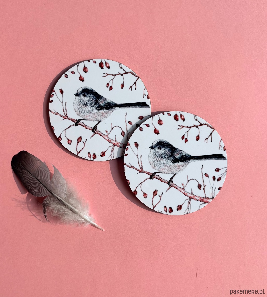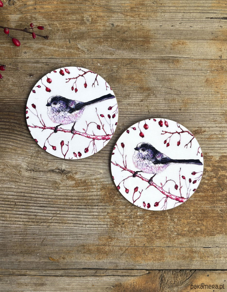 Komplet dwóch błyszczących podkładek pod kubek z autorską ilustracją.
