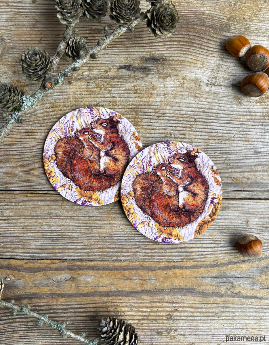 Podkładki pod kubek- Śpiące wiewórki- las- Ilustracja- Jesień
