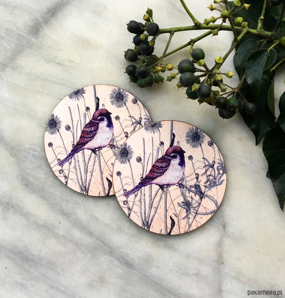 Komplet dwóch błyszczących podkładek pod kubek z autorską ilustracją.