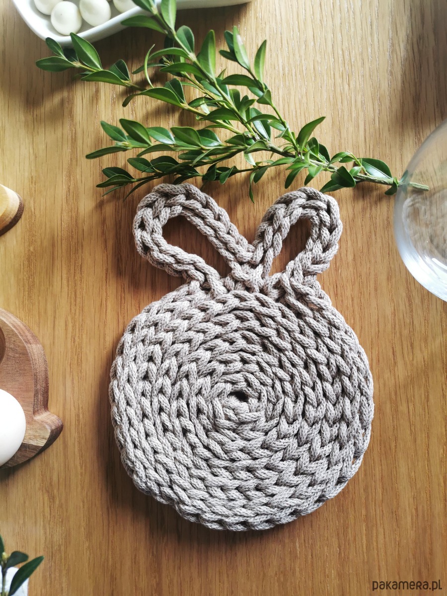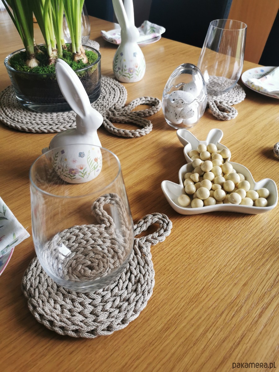Ten zestaw 4 bawełnianych podkładek pod kubek lub szklankę z uroczymi uszami królika to wyjątkowy dodatek, który wprowadza do domu ciepłą, radosną atmosferę wiosny i Wielkanocy. Każda podkładka została wykonana ze sznurka bawełnianego i zapleciona gęstym, solidnym wzorem, dzięki czemu skutecznie chroni blat stołu przed ciepłem napojów, a jednocześnie zachwyca swoją formą.