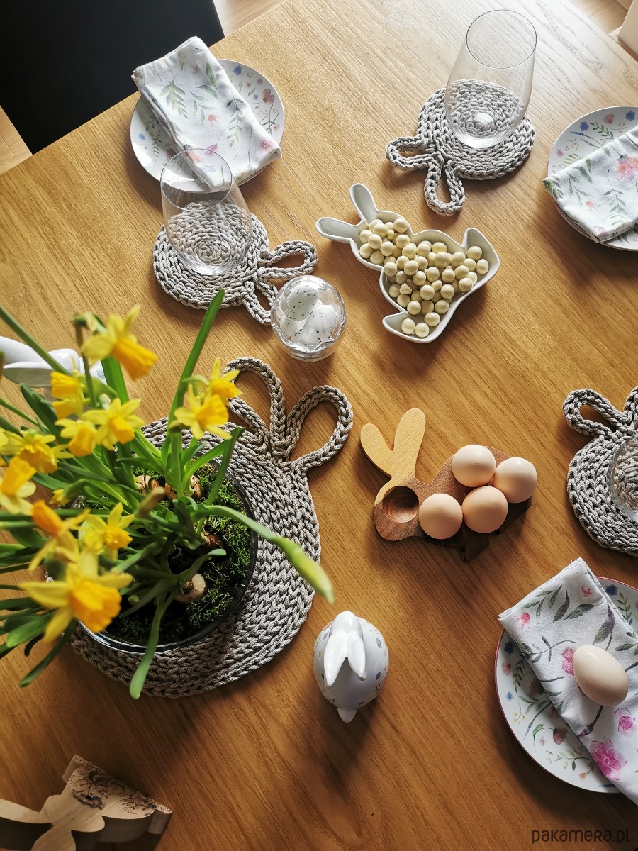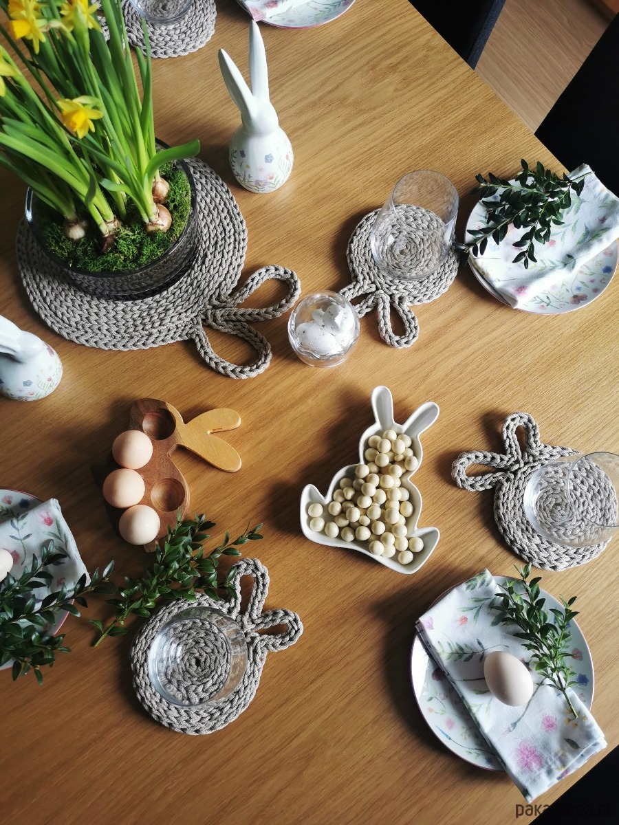 Okrągła część podkładek ma średnicę ok. 14 cm, a dekoracyjne uszy o długości ok. 5 cm nadają im lekki, świąteczny charakter. Idealnie sprawdzą się na wielkanocnym stole, podczas rodzinnego śniadania, wiosennej kawy lub herbaty z bliskimi.