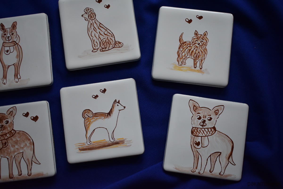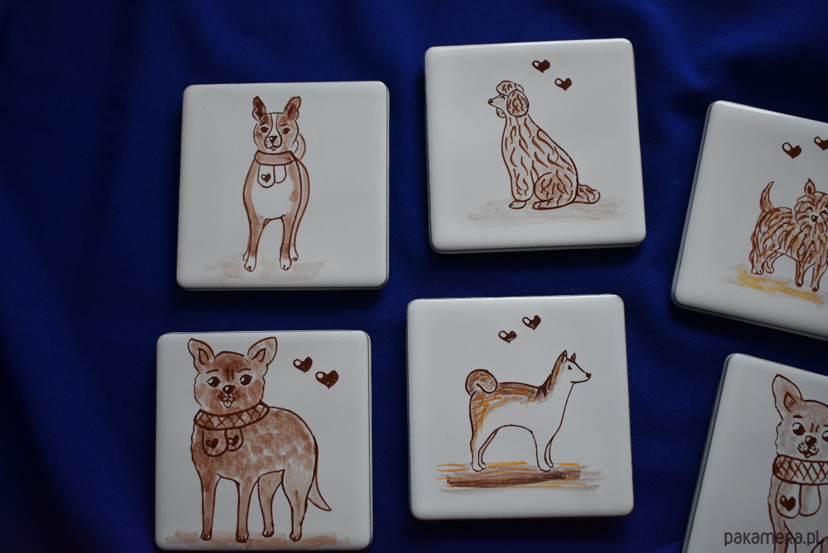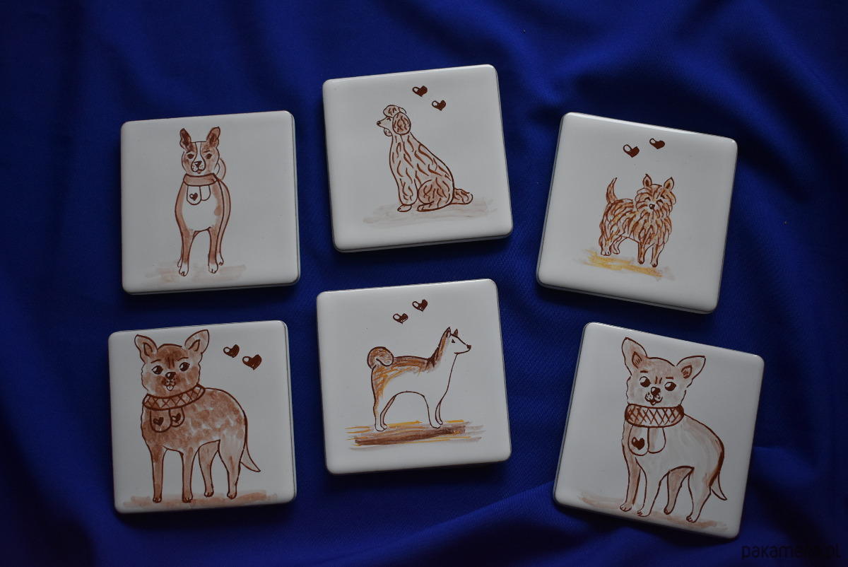 Oryginalny zestaw sześciu kafelków o wymiarach 10 × 10 cm, przedstawiających urokliwe motywy psów. Każdy kafelek został ręcznie wykonany w mojej pracowni metodą majoliki – malowany brązowym pigmentem na białym, błyszczącym szkliwie, a następnie wypalany w temperaturze ponad 1000°C.