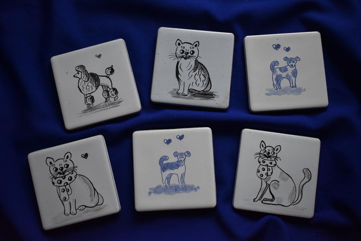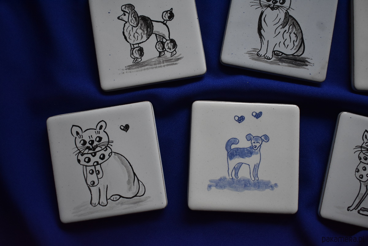 Oryginalny zestaw sześciu kafelków o wymiarach 10 × 10 cm, przedstawiających urokliwe motywy psów i kotów. Każdy kafelek został ręcznie wykonany w mojej pracowni metodą majoliki – malowany tlenkiem kobaltu lub czarnym pigmentem na szaro- błękitnym, błyszczącym szkliwie, a następnie wypalany w temperaturze ponad 1000°C.