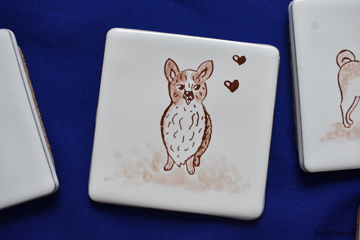 Oryginalny zestaw sześciu kafelków o wymiarach 10 × 10 cm, przedstawiających urokliwe motywy psów. Każdy kafelek został ręcznie wykonany w mojej pracowni metodą majoliki – malowany brązowym pigmentem na białym, błyszczącym szkliwie, a następnie wypalany w temperaturze ponad 1000°C.
