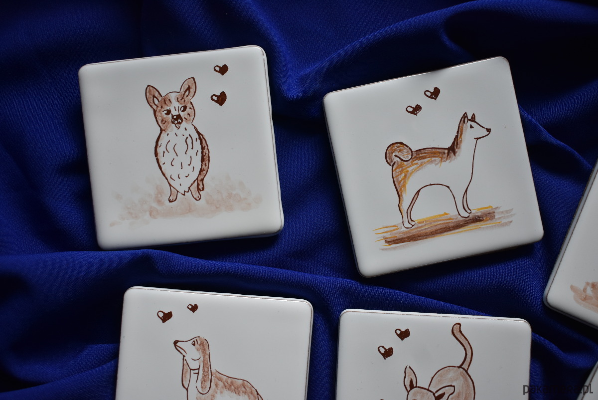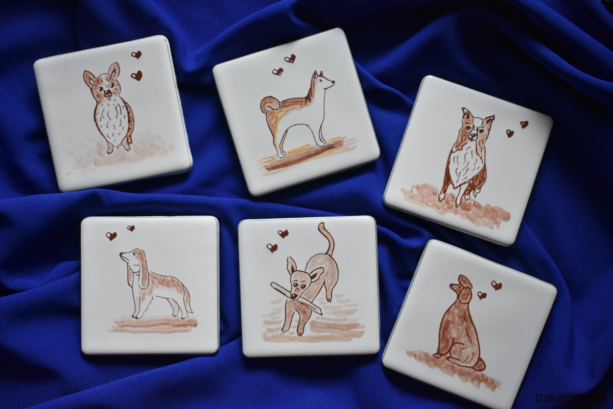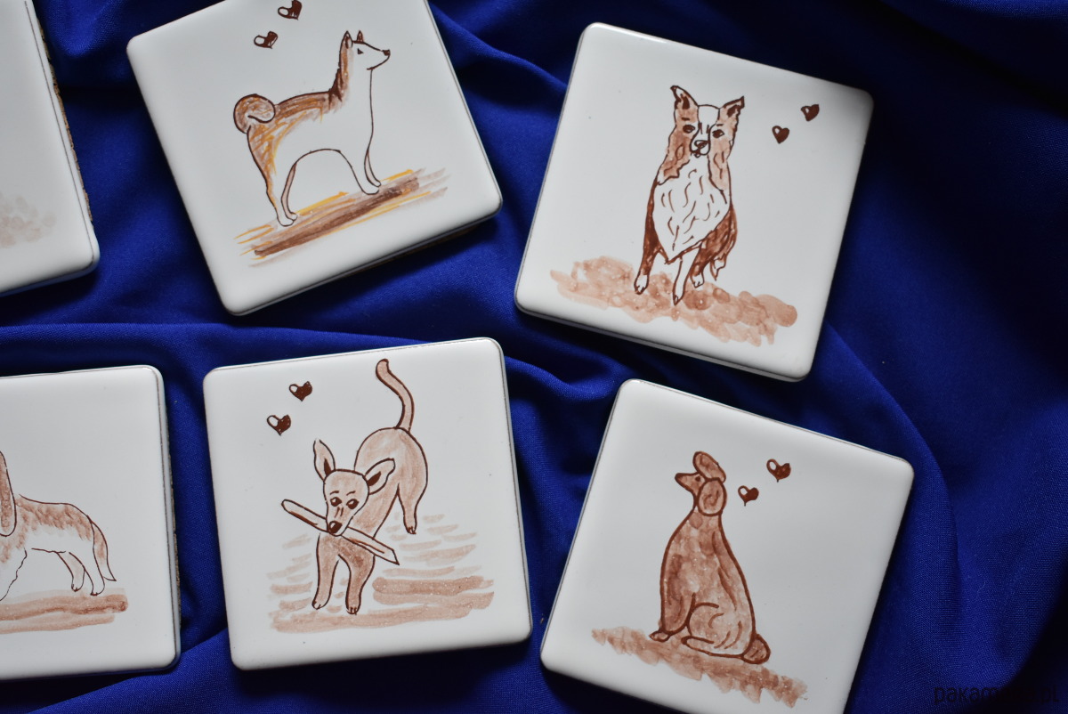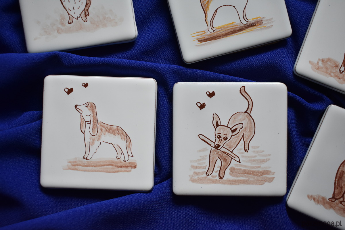 Oryginalny zestaw sześciu kafelków o wymiarach 10 × 10 cm, przedstawiających urokliwe motywy psów. Każdy kafelek został ręcznie wykonany w mojej pracowni metodą majoliki – malowany brązowym pigmentem na białym, błyszczącym szkliwie, a następnie wypalany w temperaturze ponad 1000°C.