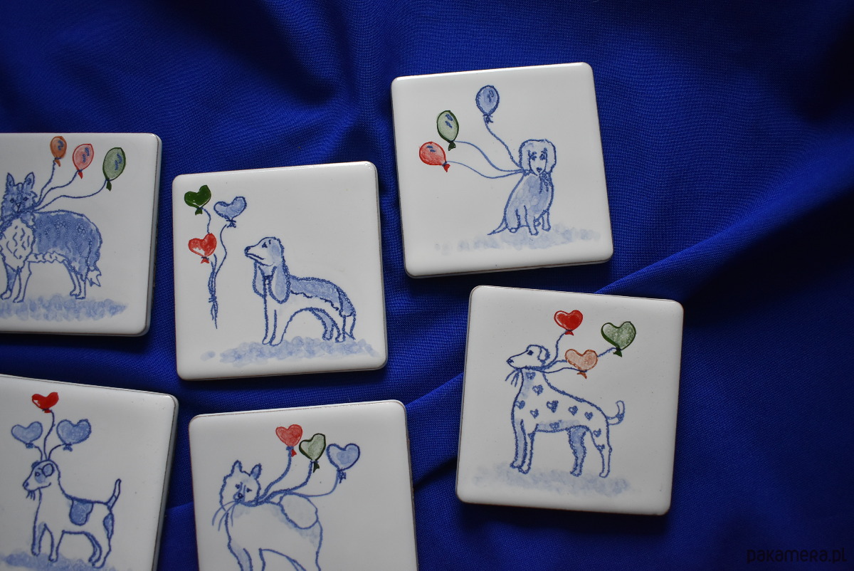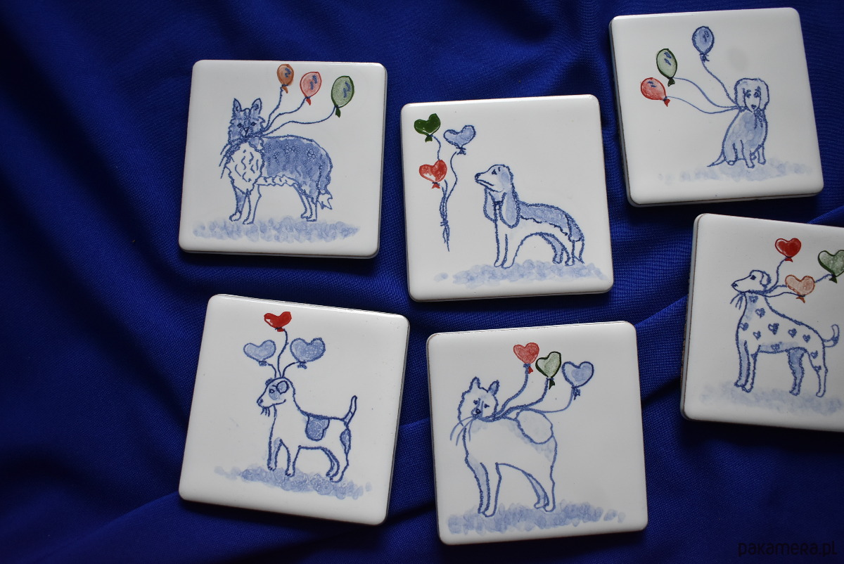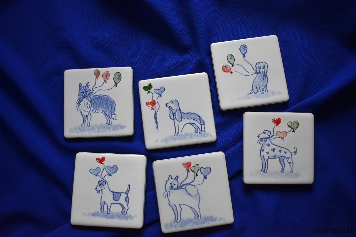 Oryginalny zestaw sześciu kafelków o wymiarach 10 × 10 cm, przedstawiających urokliwe motywy psów. Każdy kafelek został ręcznie wykonany w mojej pracowni metodą majoliki – malowany tlenkiem kobaltu na białym, błyszczącym szkliwie, a następnie wypalany w temperaturze ponad 1000°C.