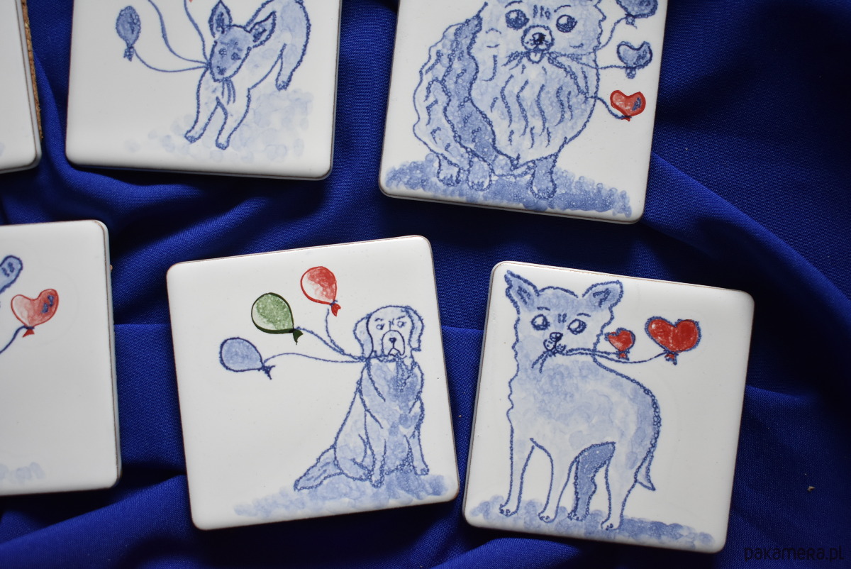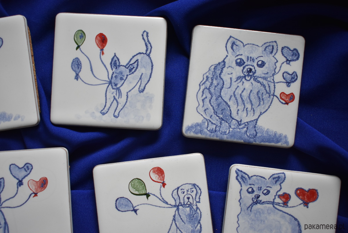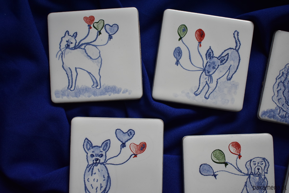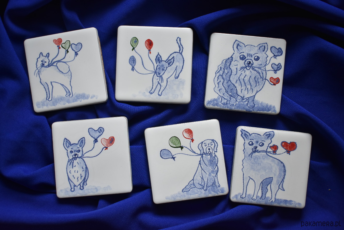 Oryginalny zestaw sześciu kafelków o wymiarach 10 × 10 cm, przedstawiających urokliwe motywy psów. Każdy kafelek został ręcznie wykonany w mojej pracowni metodą majoliki – malowany tlenkiem kobaltu na białym, błyszczącym szkliwie, a następnie wypalany w temperaturze ponad 1000°C.