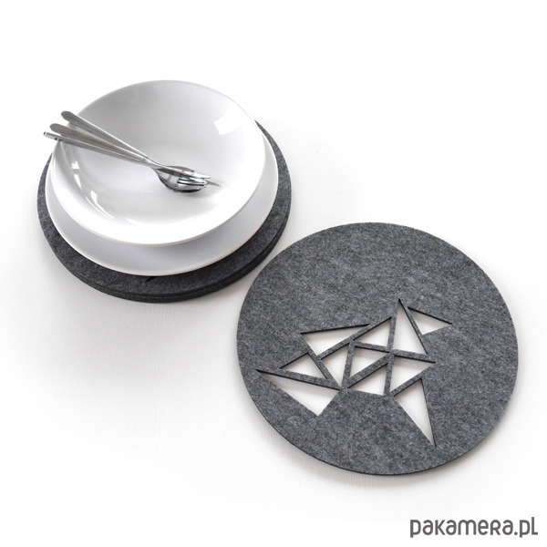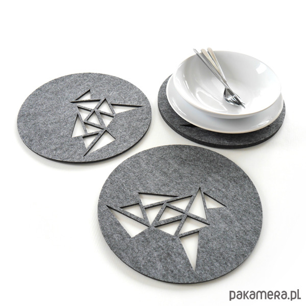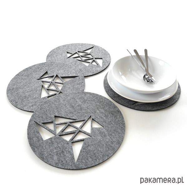 Zestaw sześciu okrągłych podkładek pod talerze. Wycięte laserowo w szarym filcu 4mm, spodnia strona lekko impregnowana, co dodatkowo chroni stół przed zniszczeniem. Wzór ażurowy, prosty, geometryczny, pięknie komponuje się z nowoczesnymi wnętrzami, filc świetnie współgra z laminowanymi powierzchniami, nadając im ciepły charakter. Polecam.