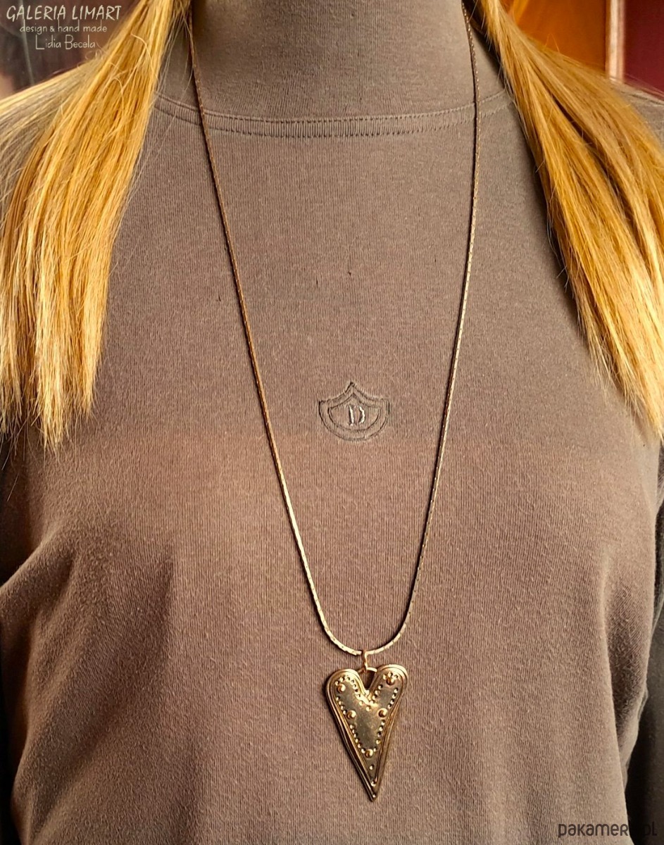 Podłużne mosiężne serce na długim łańcuszku oryginalny prezent dla niej