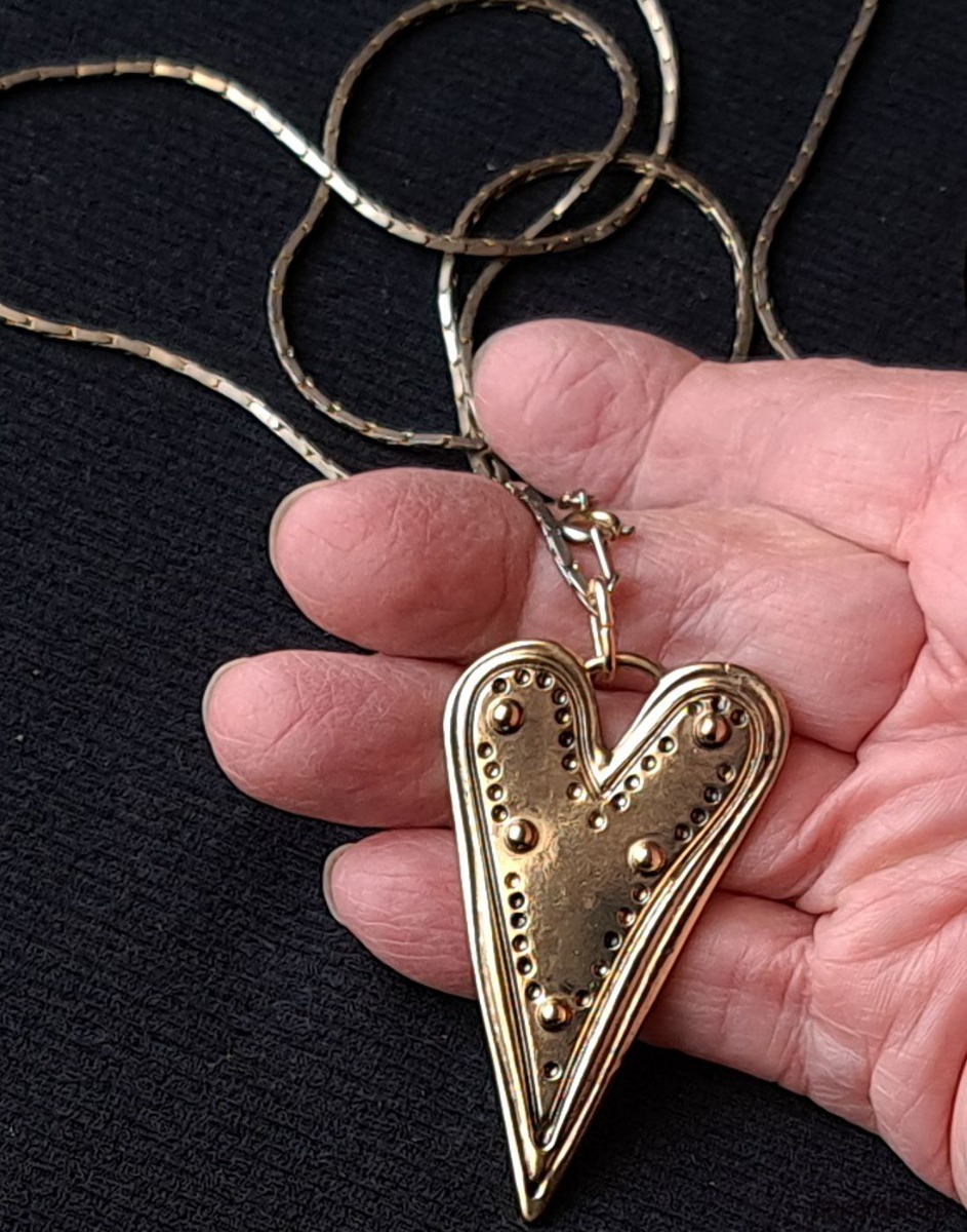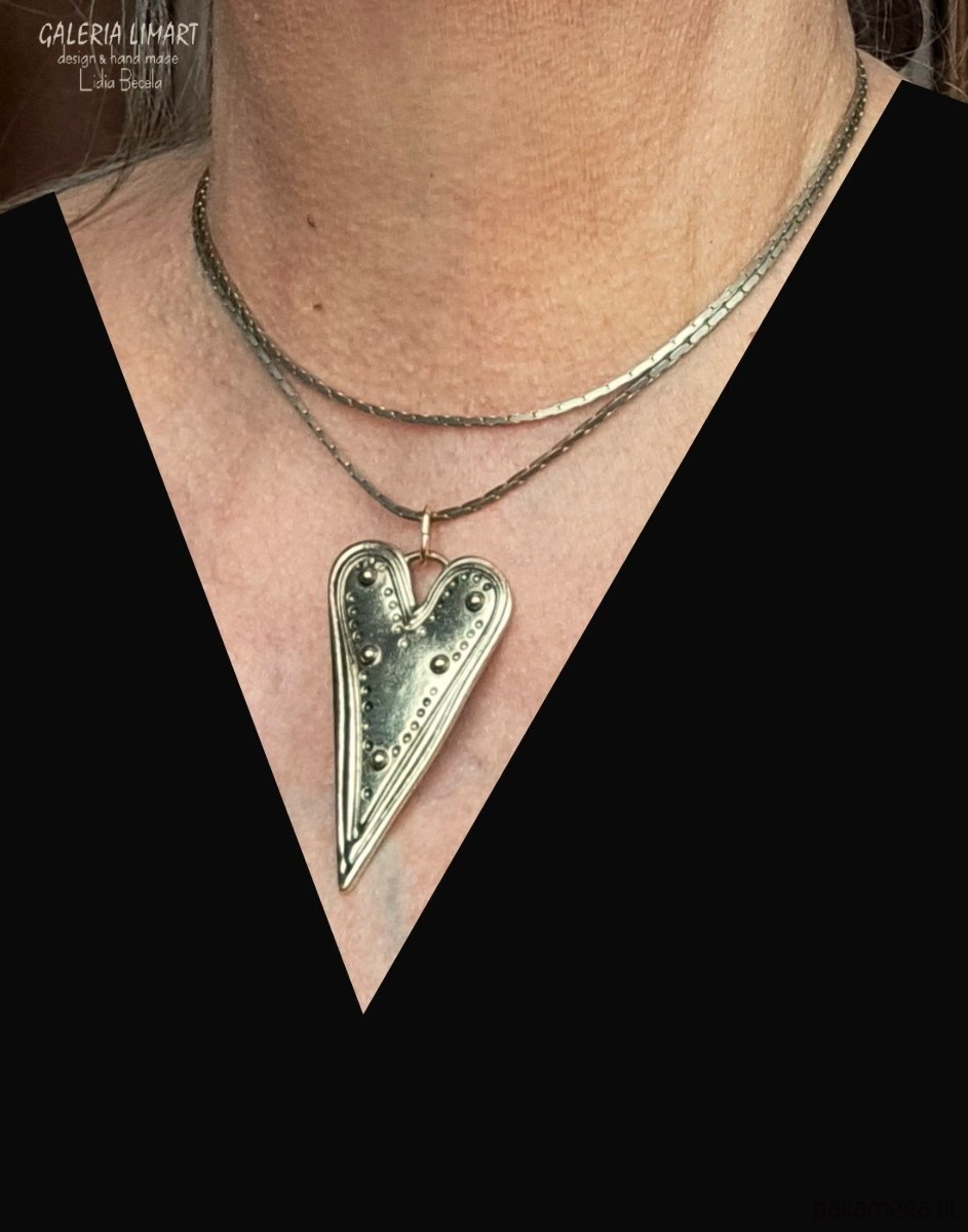 Dość niezwykłe w swoim kształcie masywne serce (ca 3x5 cm) wykute w mosiądzu zostało zawieszono na długim bardzo efektownym stalowym łańcuszku ok. 85 cm długości. Dzięki temu można go owinąć wokół szyi dwa razy i nosić na dwa sposoby, vide foto.