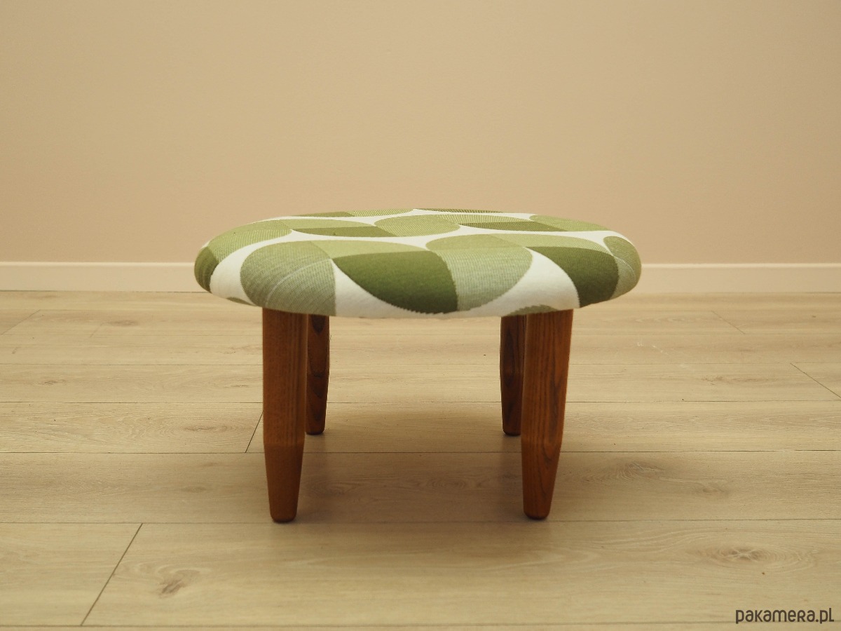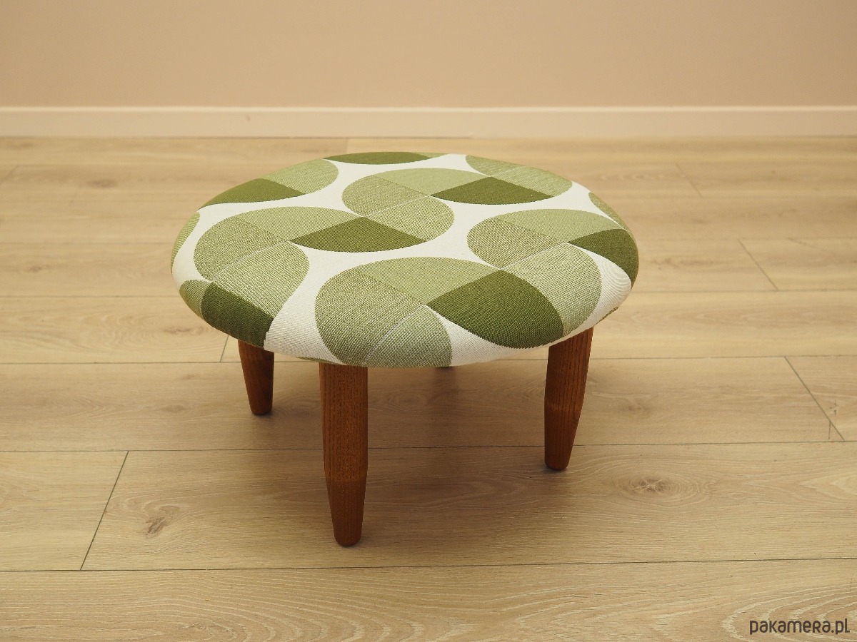 Nogi wykonane z litego drewna bukowego. Drewno po odświeżeniu. Podnóżek został poddany renowacji tapicerskiej, tkanina wymieniona na nową. Tapicerka została wykonana w kolorze zielonym i białym, wykorzystana została wysokogatunkowa tkanina o wyraźnym splocie.