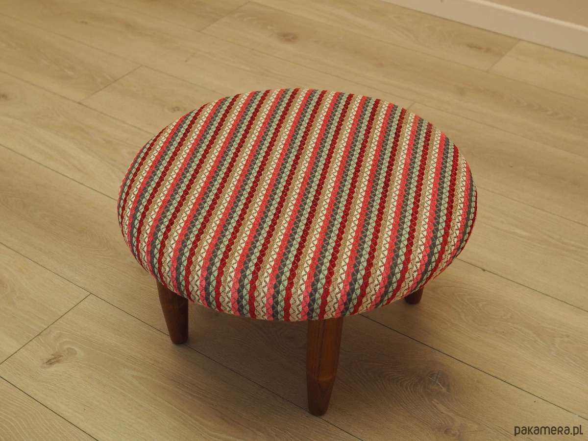Nogi wykonane z litego drewna bukowego. Drewno po odświeżeniu. Podnóżek został poddany renowacji tapicerskiej, tkanina wymieniona na nową. Wykorzystana została wysokogatunkowa tkanina o wyraźnym splocie.
