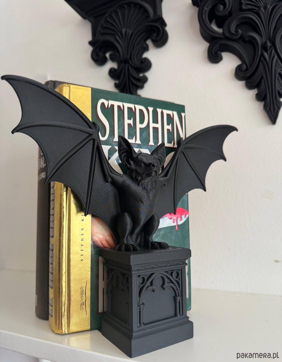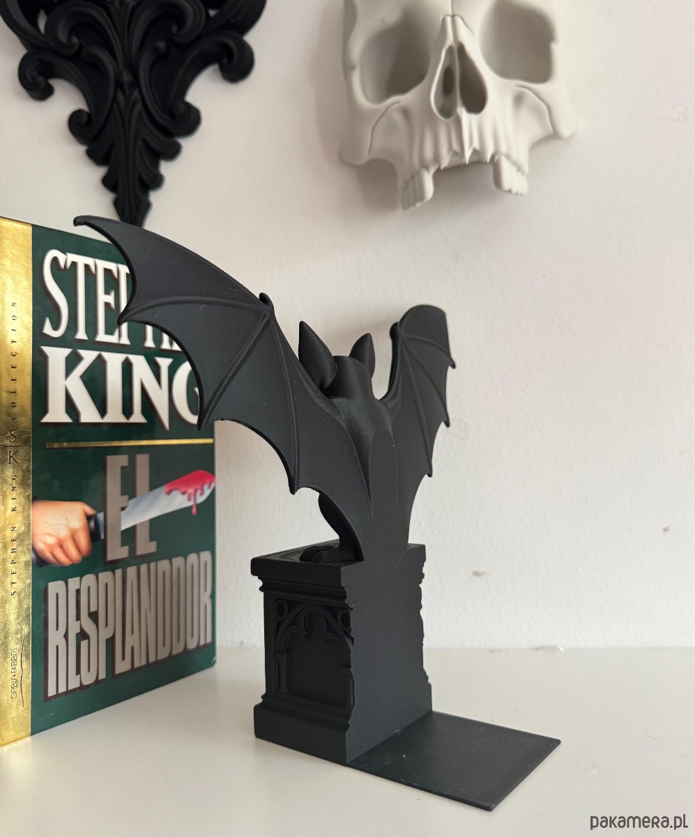 Podpórka do książek w kształcie gotyckiego monumentu z nietoperzem, wydrukowana z biodegradowalnego PLA. Projekt inspirowany estetyką gotycką, motywami makabrycznymi oraz stylem dark academia będzie doskonale pasował na półkach z książkami, albumami lub innymi przedmiotami.