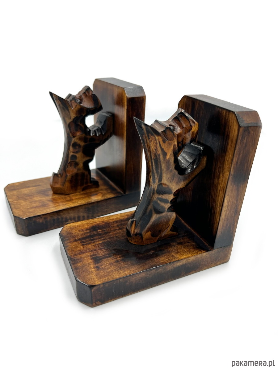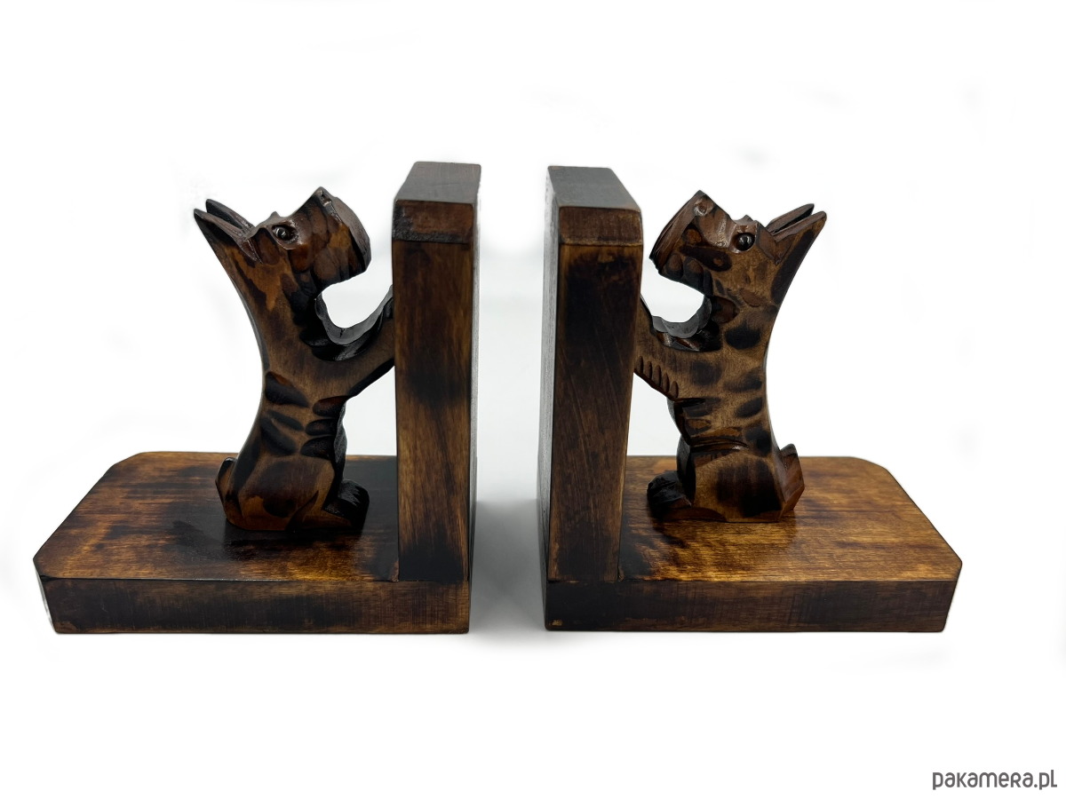 Unikalny komplet drewnianych podpórek do książek w stylu vintage, przedstawiający dwa pieski rasy terrier . To nie masowa produkcja, lecz autentyczne rękodzieło sprzed kilkudziesięciu lat (ok. lata 60.–70. XX wieku).