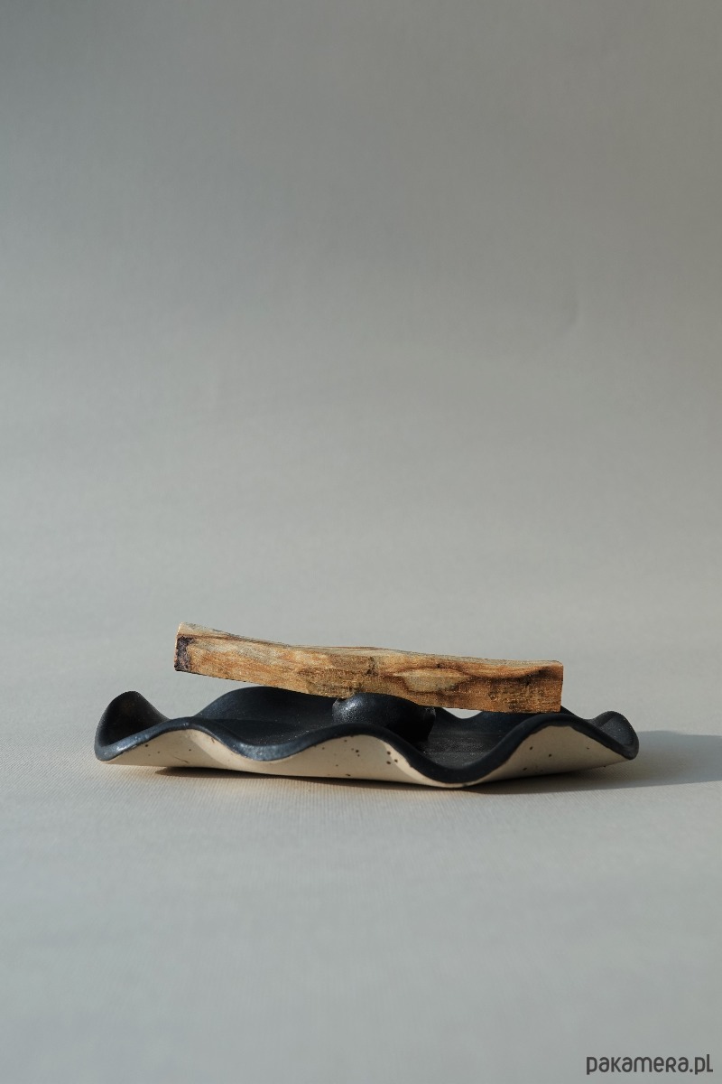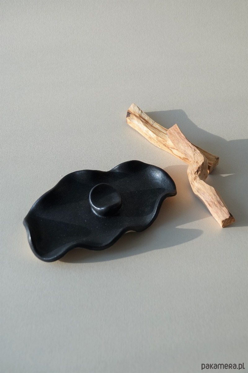 Lepiony ręcznie. Podpórka na kadzidełko wyrasta na środku niczym perła, a organiczne kształty wprowadzają w stan relaksu.