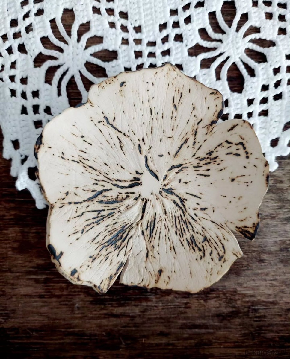 Dekor stanowi odbitkę żywego kwiatu, w kolorze beżowym, miejscowo barwiony na czarny kolor celem uwidocznionienia naturalnej struktury rośliny. Drobny unikatowy prezent dla miłośniczki biżuterii.